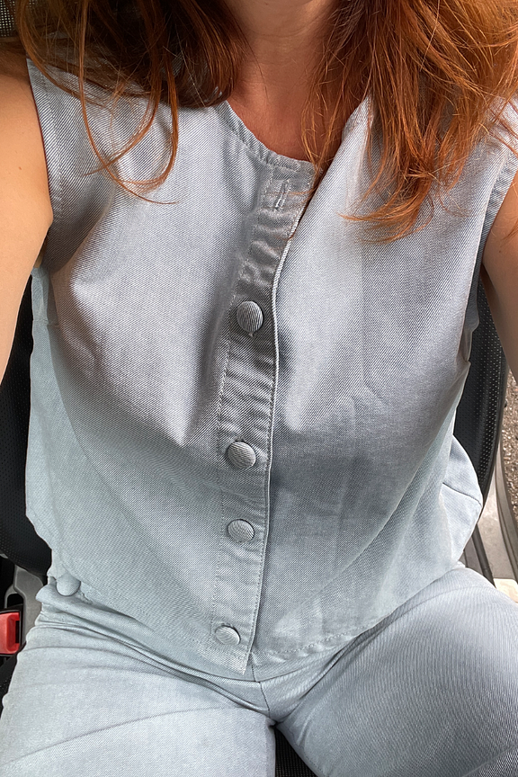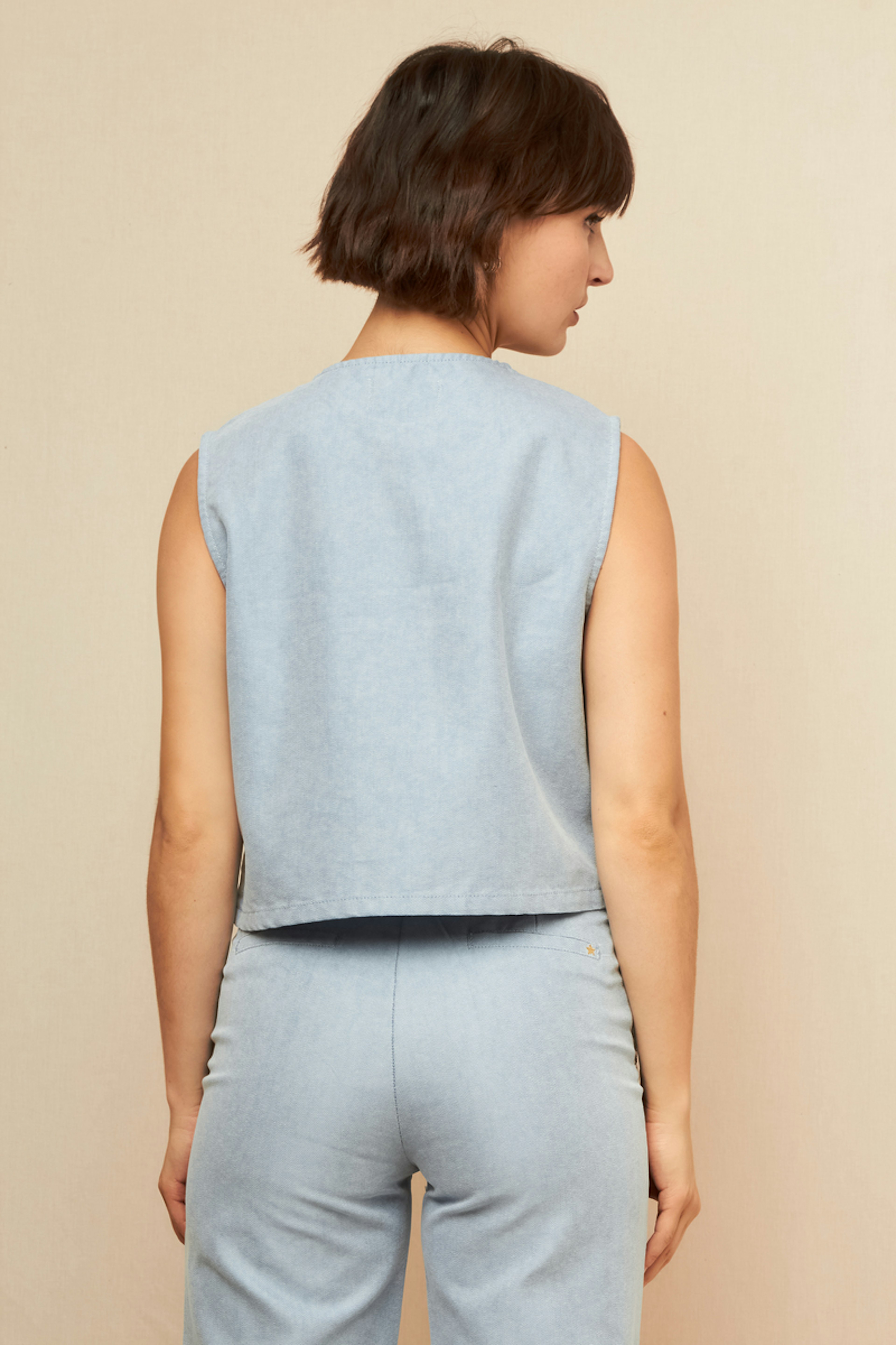 Speel minimalistisch chic met deze blauwe blazer. Combineer hem met een broek met hoge taille en pumps voor een elegante look. - Katoen-polyester blazer - Slanke pasvorm - Mouwloos - Knoopsluiting - Strakke look