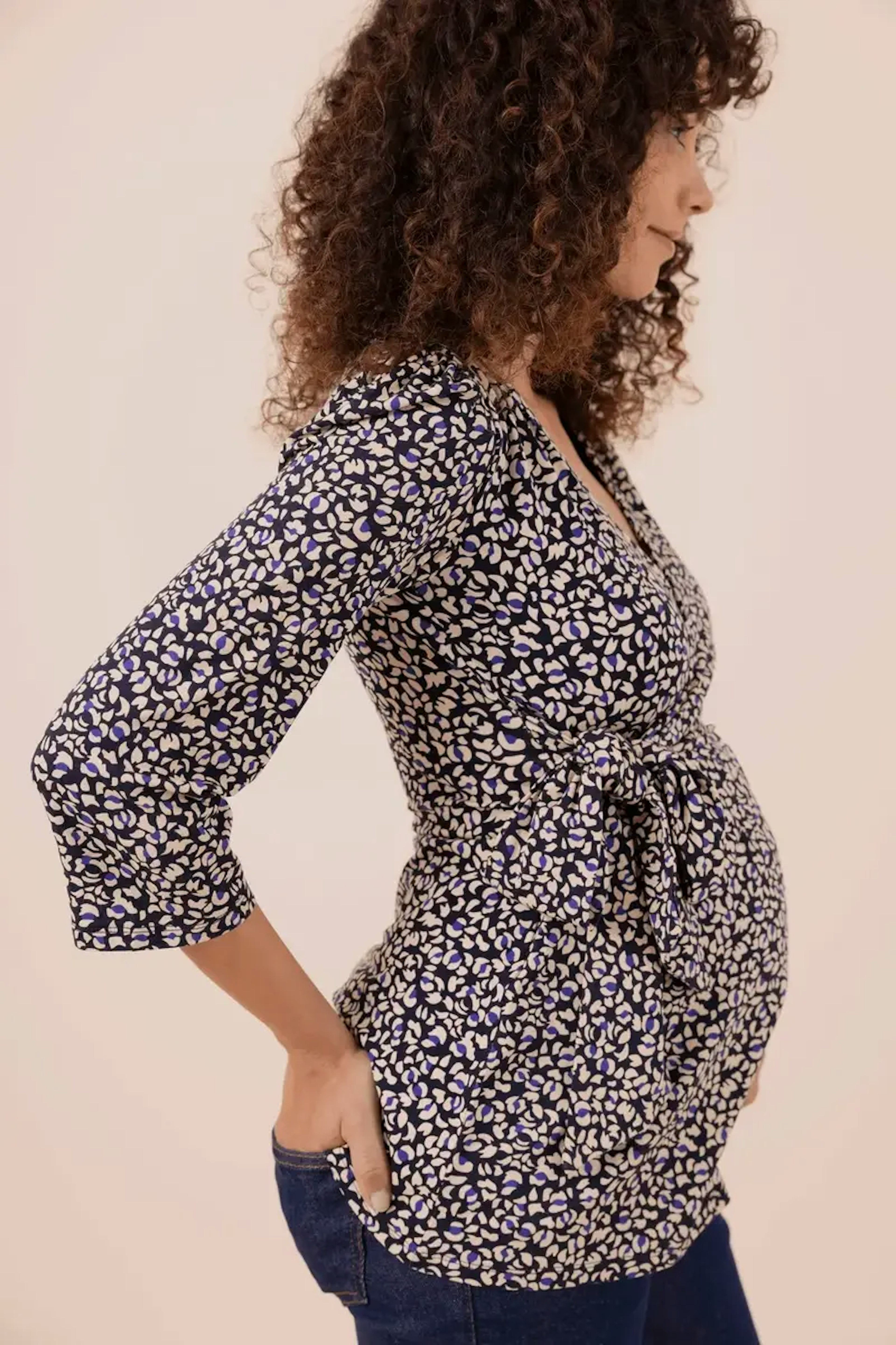 - Borstvoeding - Cover-up - Driekwart mouwen - Zachte, comfortabele stof - Ultrazachte stretch jersey - Kleur: marine achtergrond/ecru en blauwe patronen Deze zwangerschapstop is een must-have voor je garderobe! Altijd gemakkelijk te combineren met een rok, broek of jeans. De kleine extra's: een stof die heel comfortabel draagt en een discreet zoogsysteem. Knoop de tailleband aan de zijkant om je taille boven je buik te laten zien! Tip: Om de tailleband van deze wikkeltop te knopen, passeer je de langere tailleband langs je rug en de kortere tailleband onder je buste en knoop je de 2 taillebanden aan de zijkant.