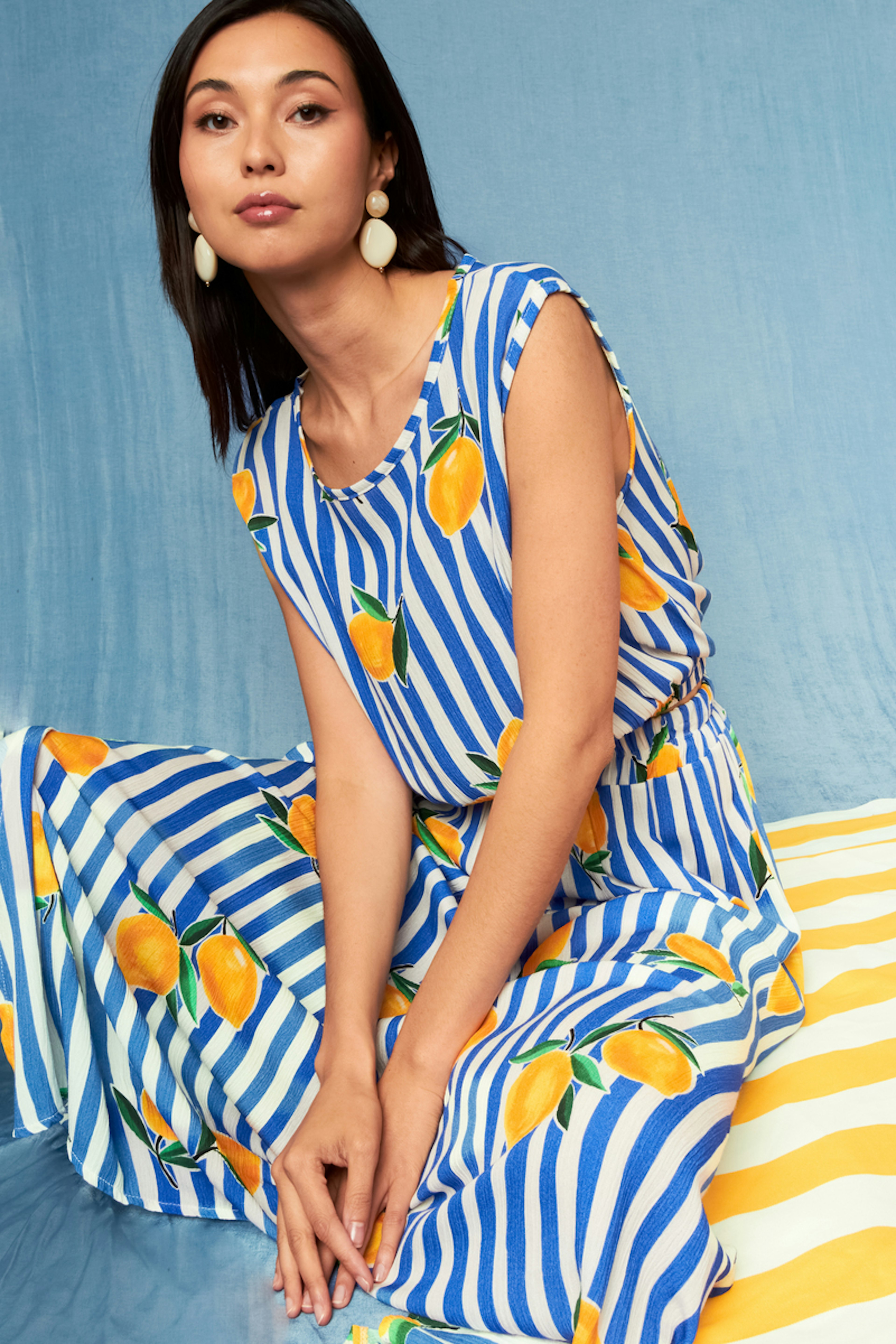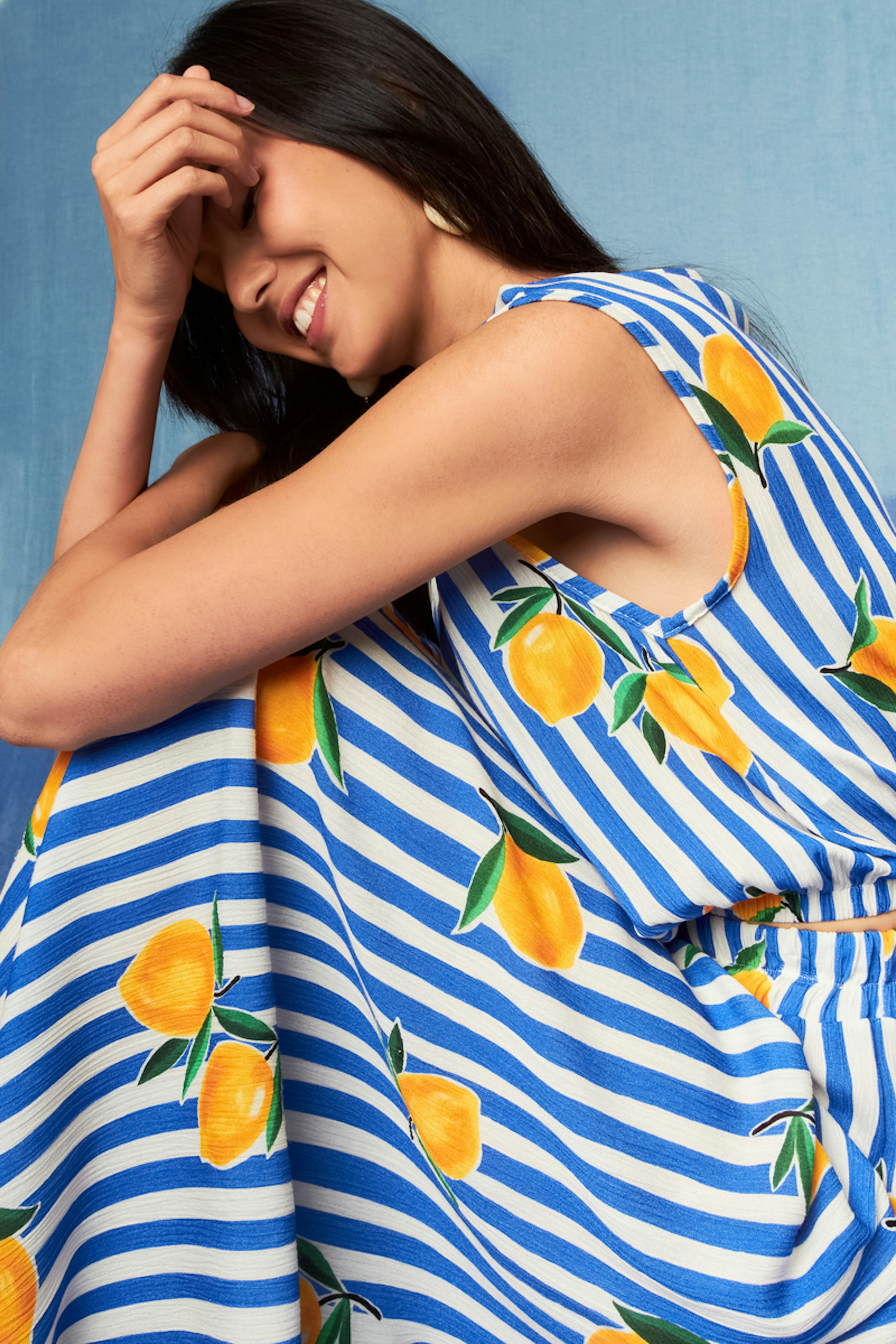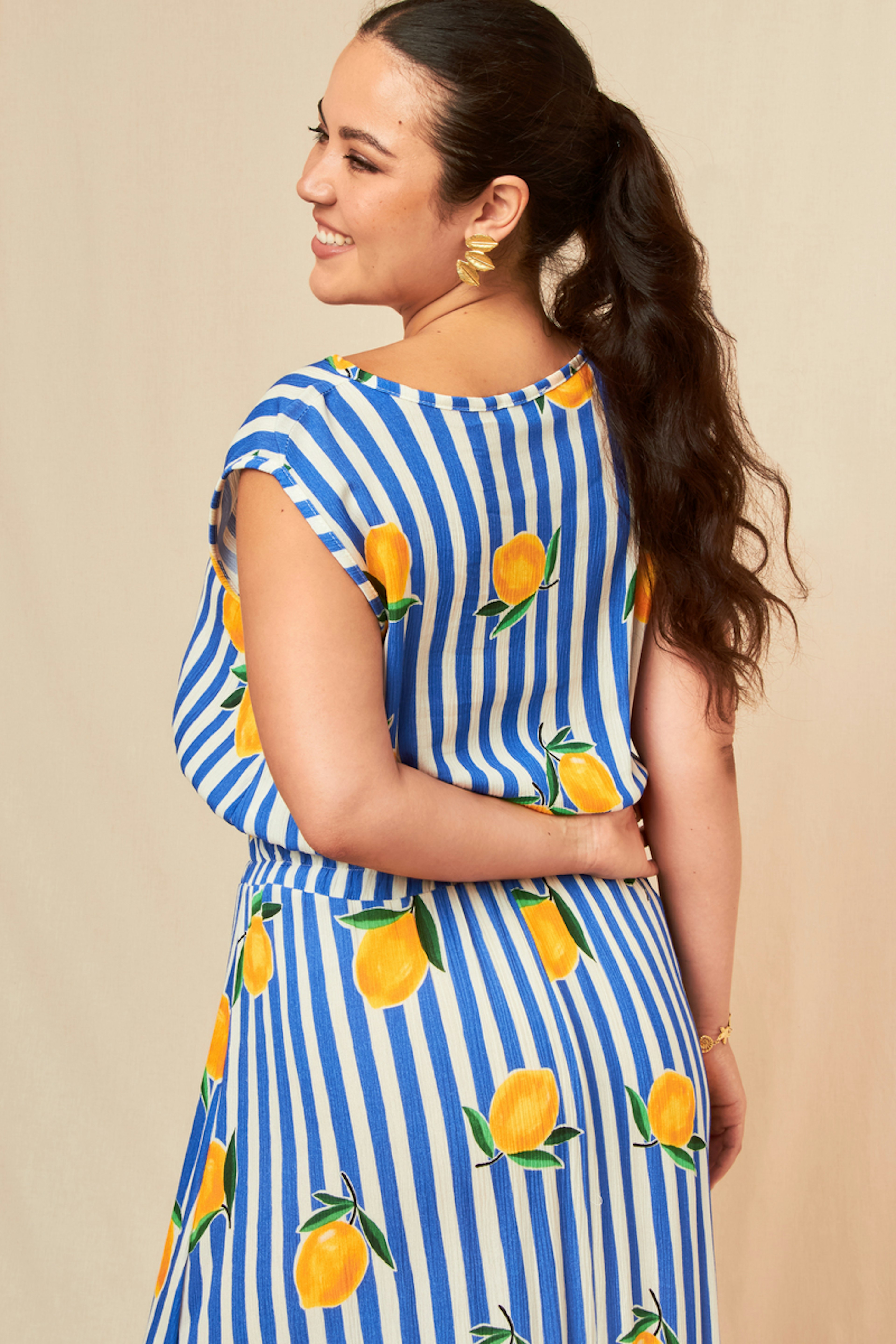 Combineer deze top met een witte rok voor een frisse, zomerse look. Maak de look af met gouden sandalen. - Katoenen top - Ongedwongen pasvorm - Korte mouwen - Ronde halslijn - Strepen en fruitpatroon