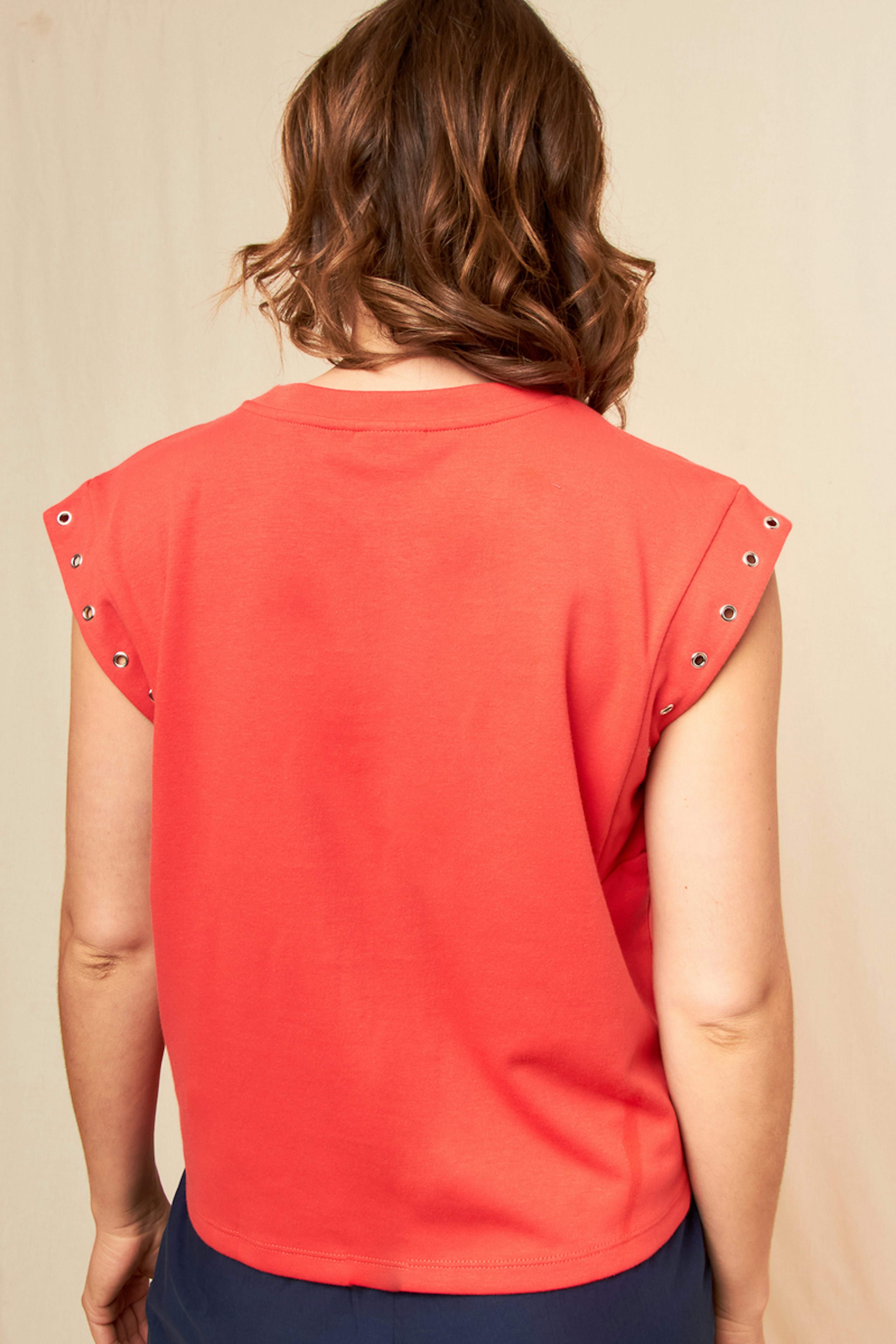 Geef je outfit een dynamische touch met deze felrode top. Perfect met een casual jeans of een vrouwelijke rok voor een smart-casual look. - Losvallende top van katoenmix - Schouderbandjes met metalen oogjes - Comfortabel recht model - Mouwloos voor meer vrijheid - Heldere rode tint