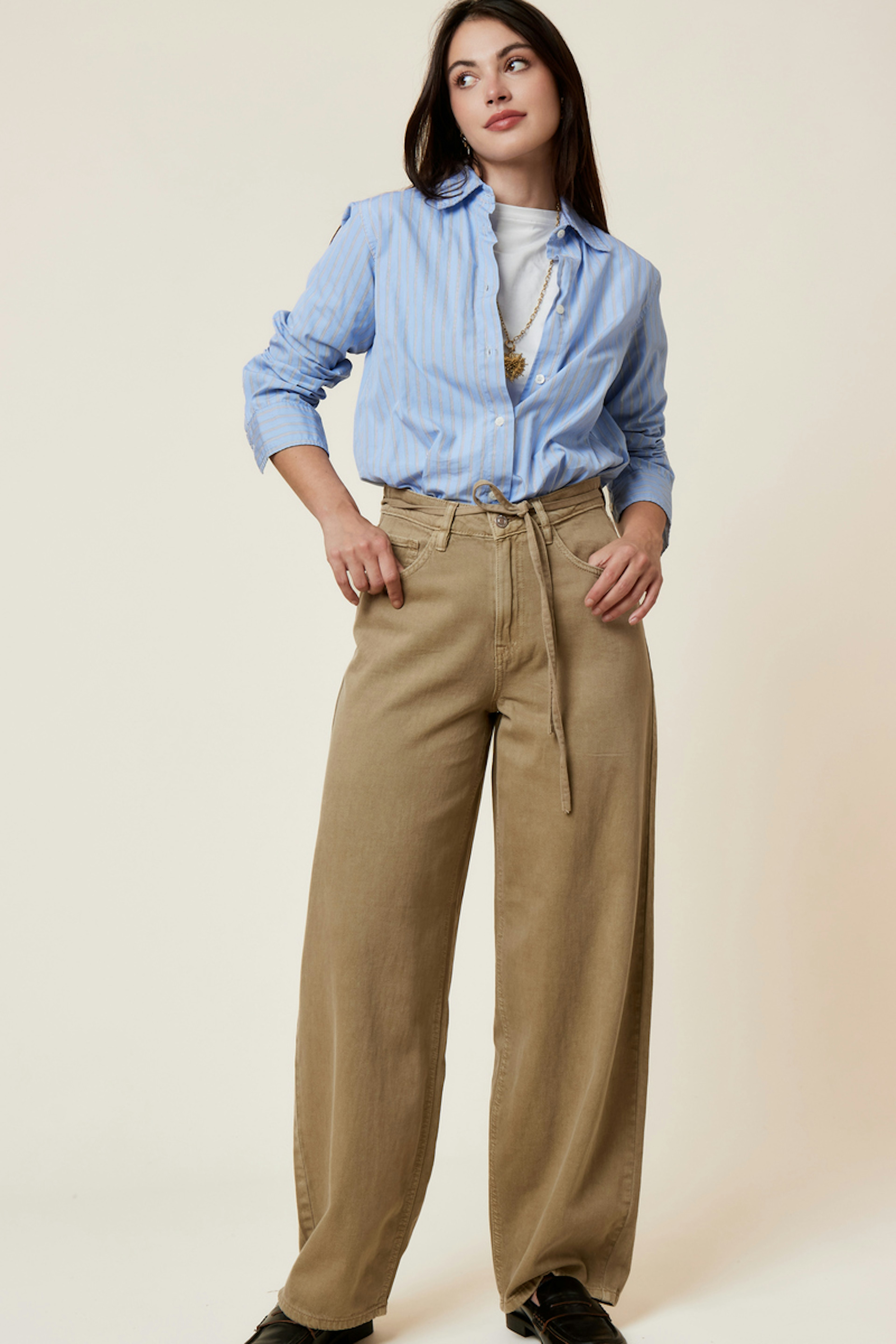 Combineer deze kaki jeans met een kleurrijke top en sneakers voor een casual look. Perfect voor een comfortabele dagelijkse stijl. • Katoenen broek • Ruime en losse snit • Hoge taille met strikceintuur • Lange, vloeiende benen • Discrete zijzakken