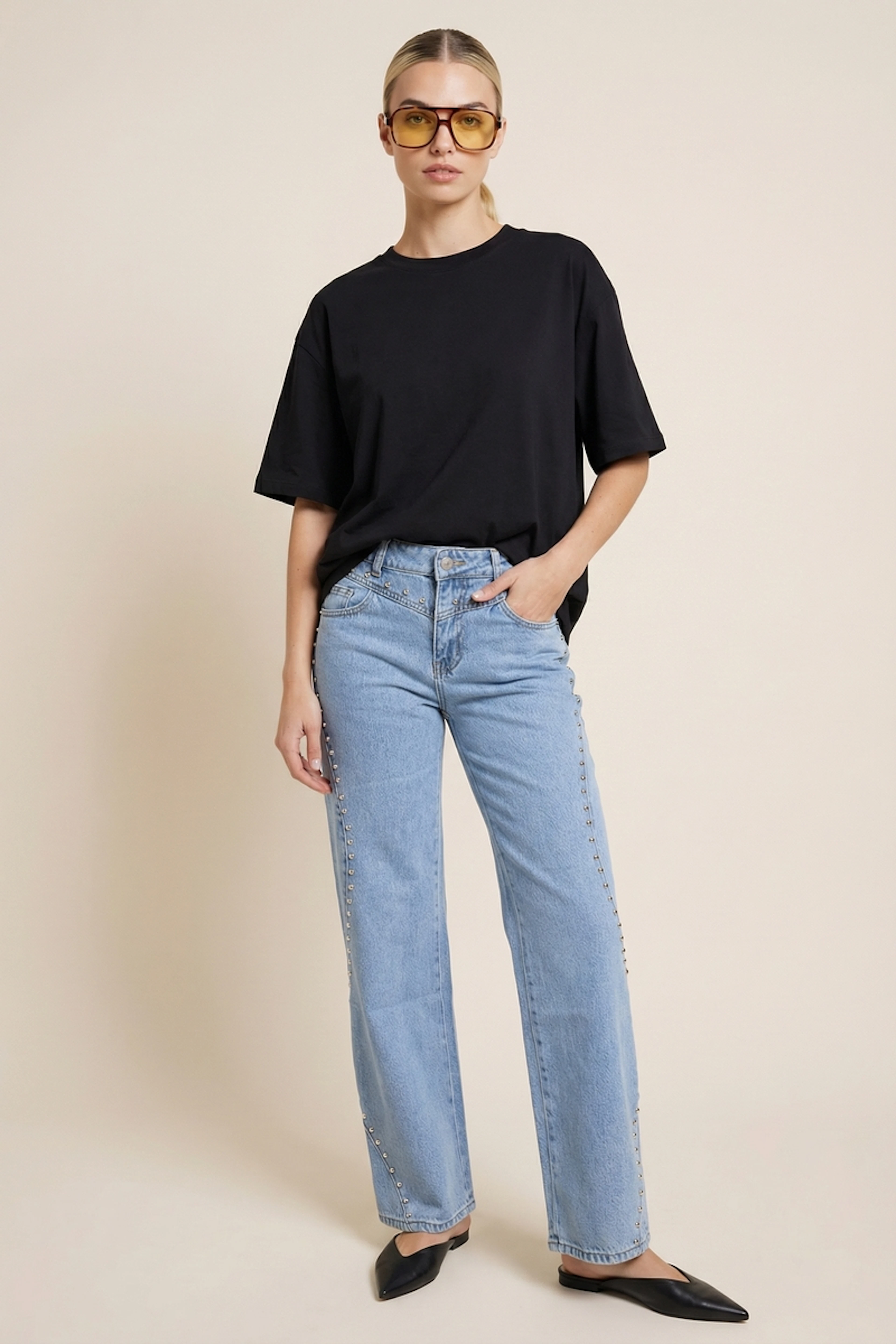 Voor een chique en casual look, combineer deze jeans met een slim-fit t-shirt en leren mocassins. • Jeans met rechte pasvorm • Middelhoge taille • Studded details • Enkel lengte • Klassieke zakken