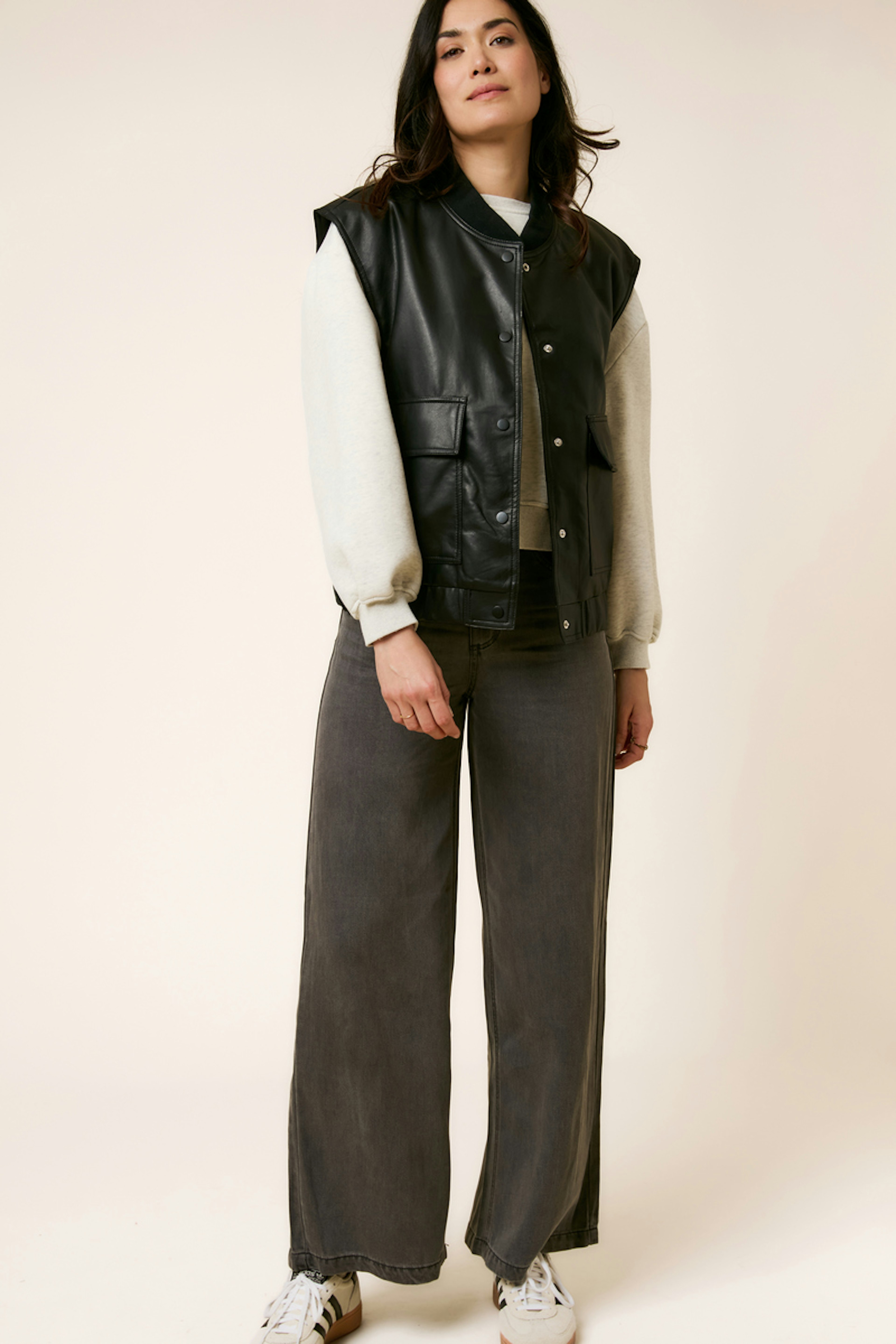 Combineer deze ruime spijkerbroek met een aansluitende top en enkellaarsjes voor een moderne uitstraling. Perfect voor elk seizoen. • Ruime snit • Flatterende hoge taille • Brede, vloeiende benen • Elegante grijze stof • Discrete ritssluiting
