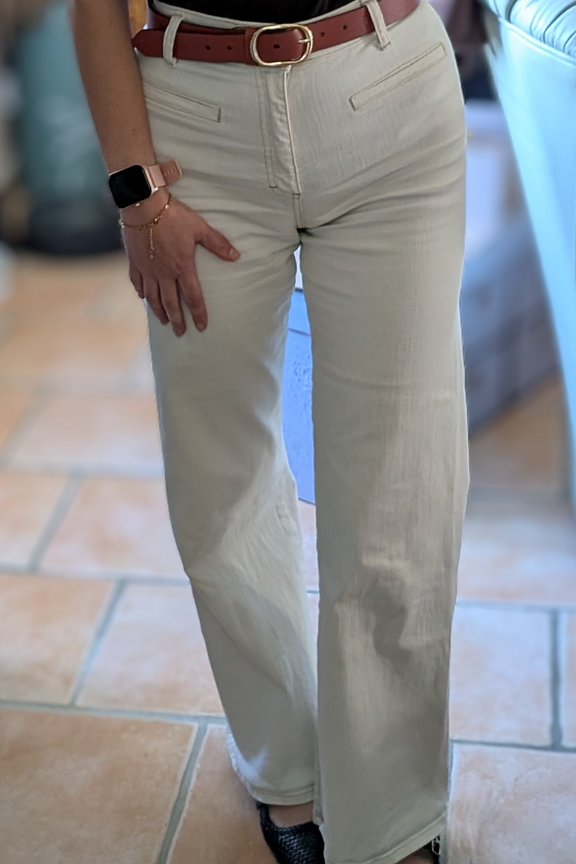 Combineer deze beige jeans met een lichtgewicht denim shirt en strappy sandalen voor een chique, casual look het hele jaar door. - Jeans met wijde pijpen - Hoge taille - Vloerlengte - Knoopsluiting - Zakken met paspels