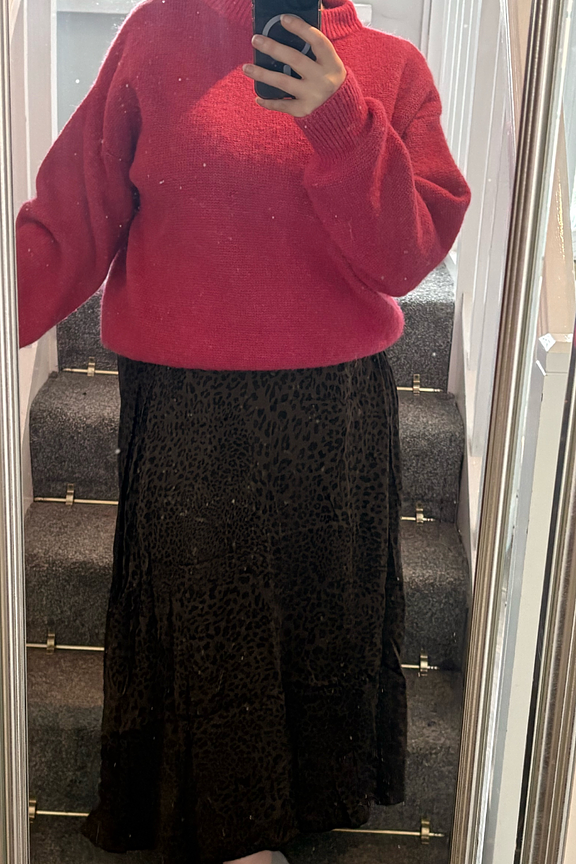 Combineer deze vloeiende rok met een crèmekleurige kasjmier trui voor een chique, comfortabele winterlook. - Satijnen rok - Uitlopend model - Halflang - Luipaardprint