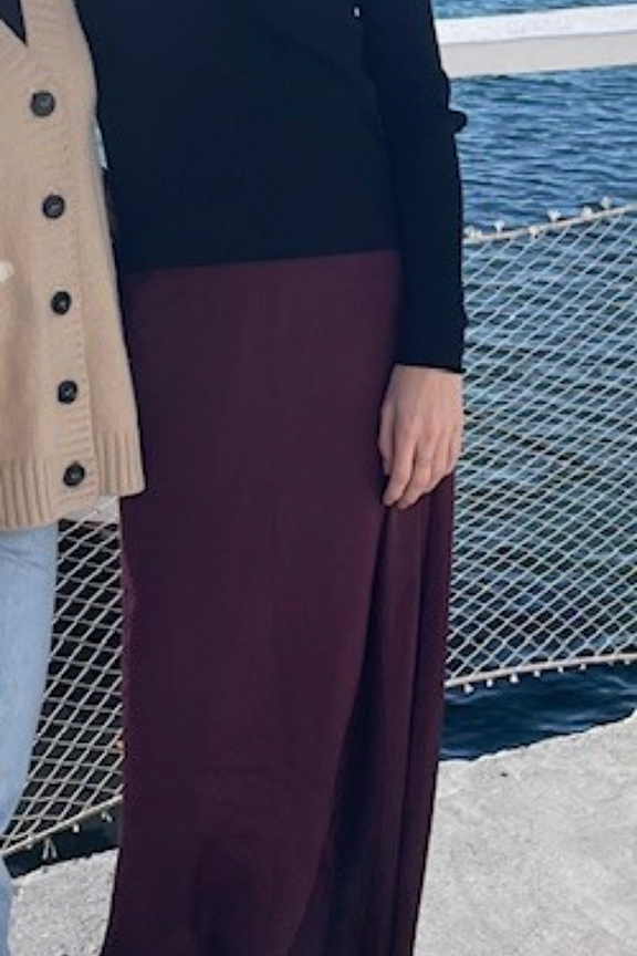 Combineer deze vloeiende rok met een oversized jumper en enkellaarsjes voor een chique, casual look in de winter. - Halflange satijnen rok bordeauxrood - Vloeiend model - Halfhoge taille - Satijnen stof
