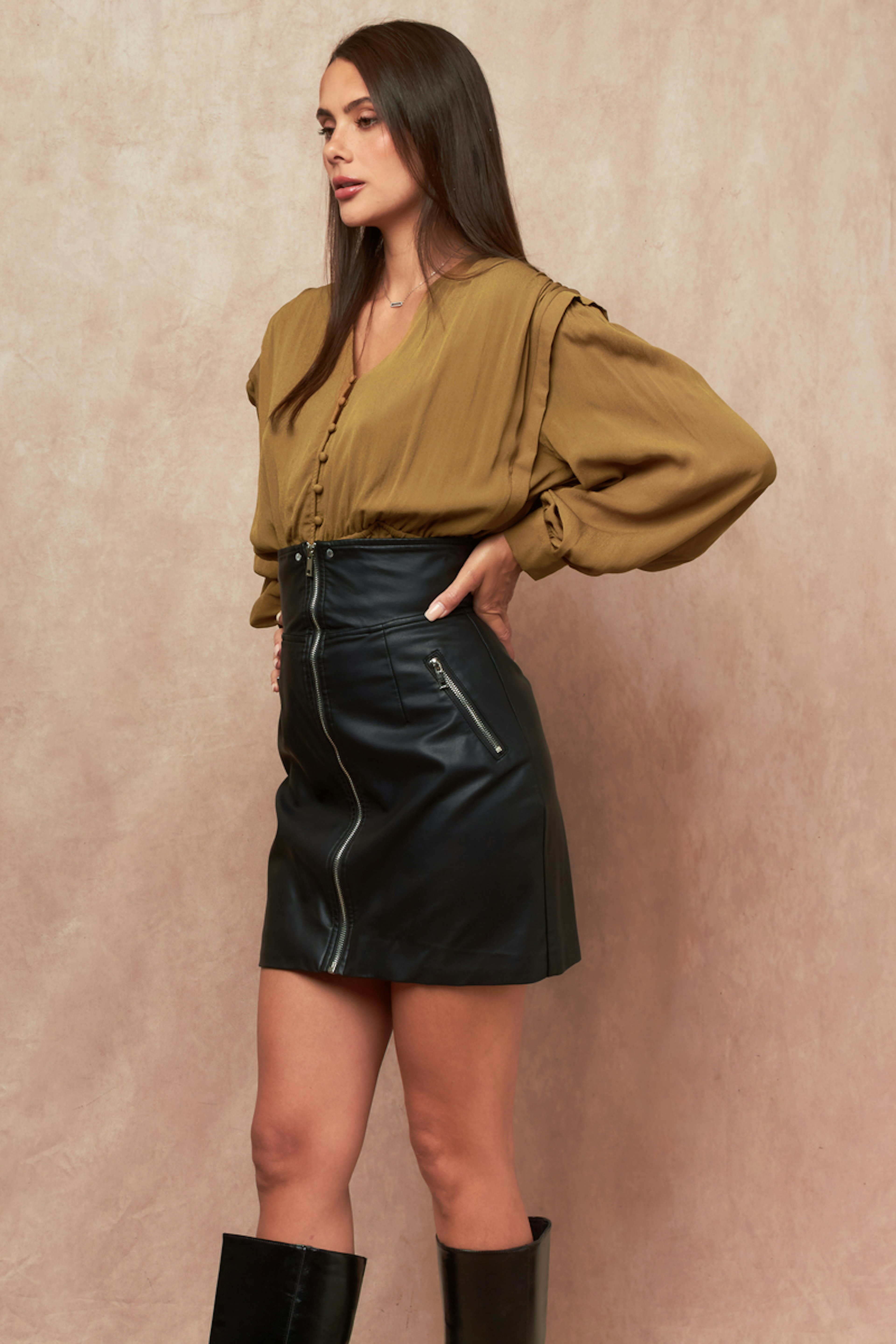 Combineer deze rok van imitatieleer met een trui van kasjmier en hoge laarzen voor een chique winterlook. - Korte rok - Ritssluiting aan de voorkant - Hoge taille - Sierzakken - Zwart imitatieleer
