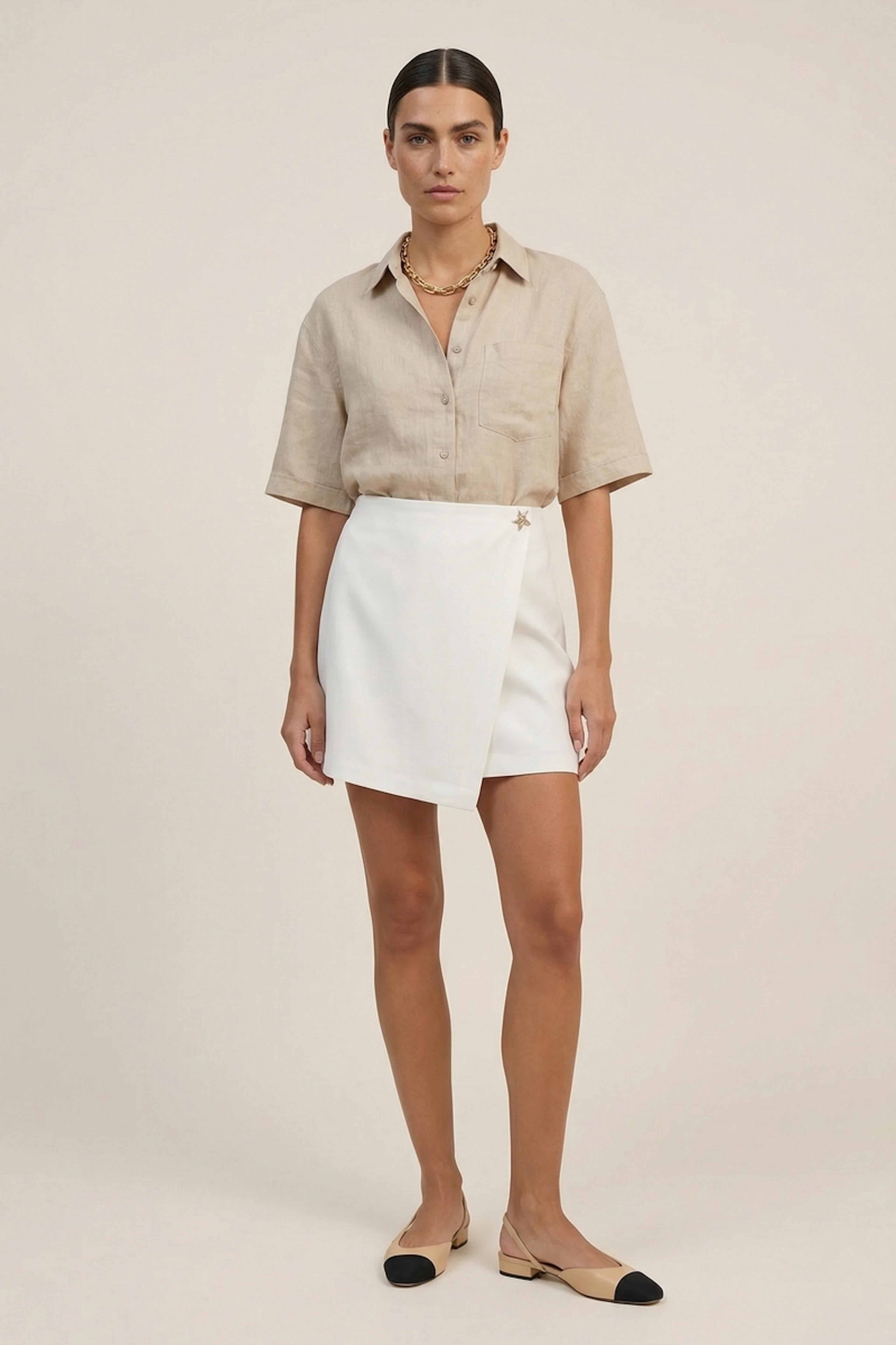 Voeg een luchtige witte blouse toe voor een chique zomerse look. • Rok portemonnee • Flatterende uitlopende snit • Verfijnde hoge taille • Elegante kruizing sluiting • Delicaat ornamentdetail