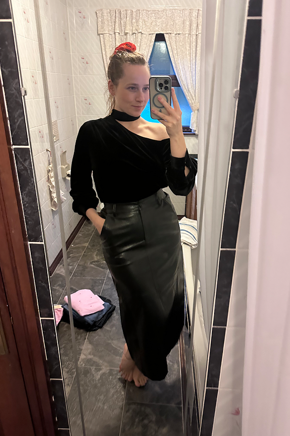 “Het past prachtig, maar heeft zeker een voering nodig. De binnenkant van de rok was erg jeukerig. Ik droeg panty’s onder de rok om mijn huid te beschermen, maar toen ik ging zitten, prikte het jeukende materiaal door mijn panty’s en irriteerde het mijn huid terwijl ik zat. Dat was jammer, omdat ik dol was op de manier waarop het paste en hoe het er van buiten uitzag.”