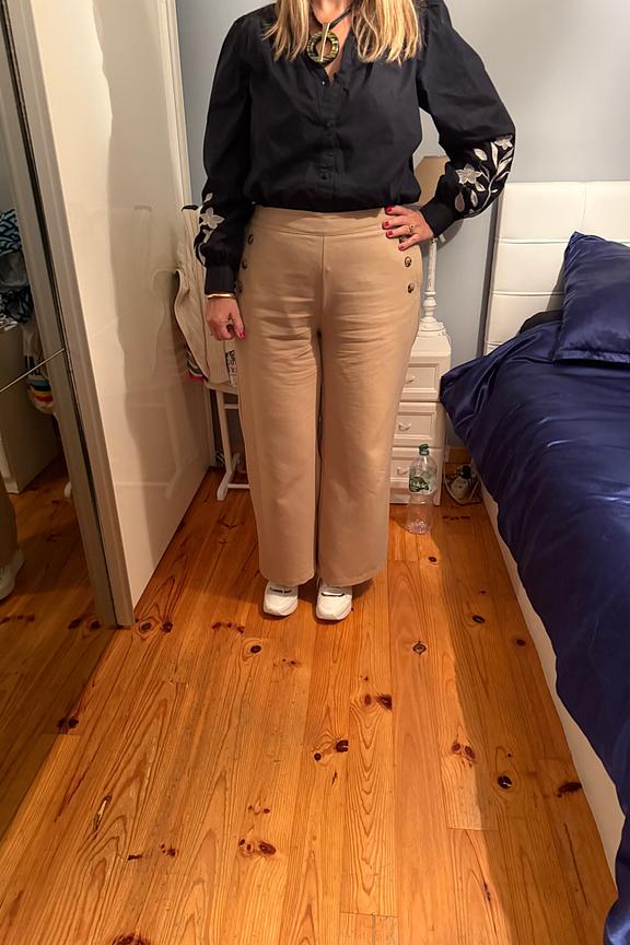 Verfraai je stijl met deze veelzijdige beige broek, perfect voor elk seizoen. Combineer hem met een getailleerde top voor een evenwichtige look en maak hem af met gouden accessoires voor een vleugje elegantie. - Broek met wijde pijpen - Elastische hoge taille - Knoopsluiting aan de zijkant - Onopvallende zakken - Met zorg afgewerkt