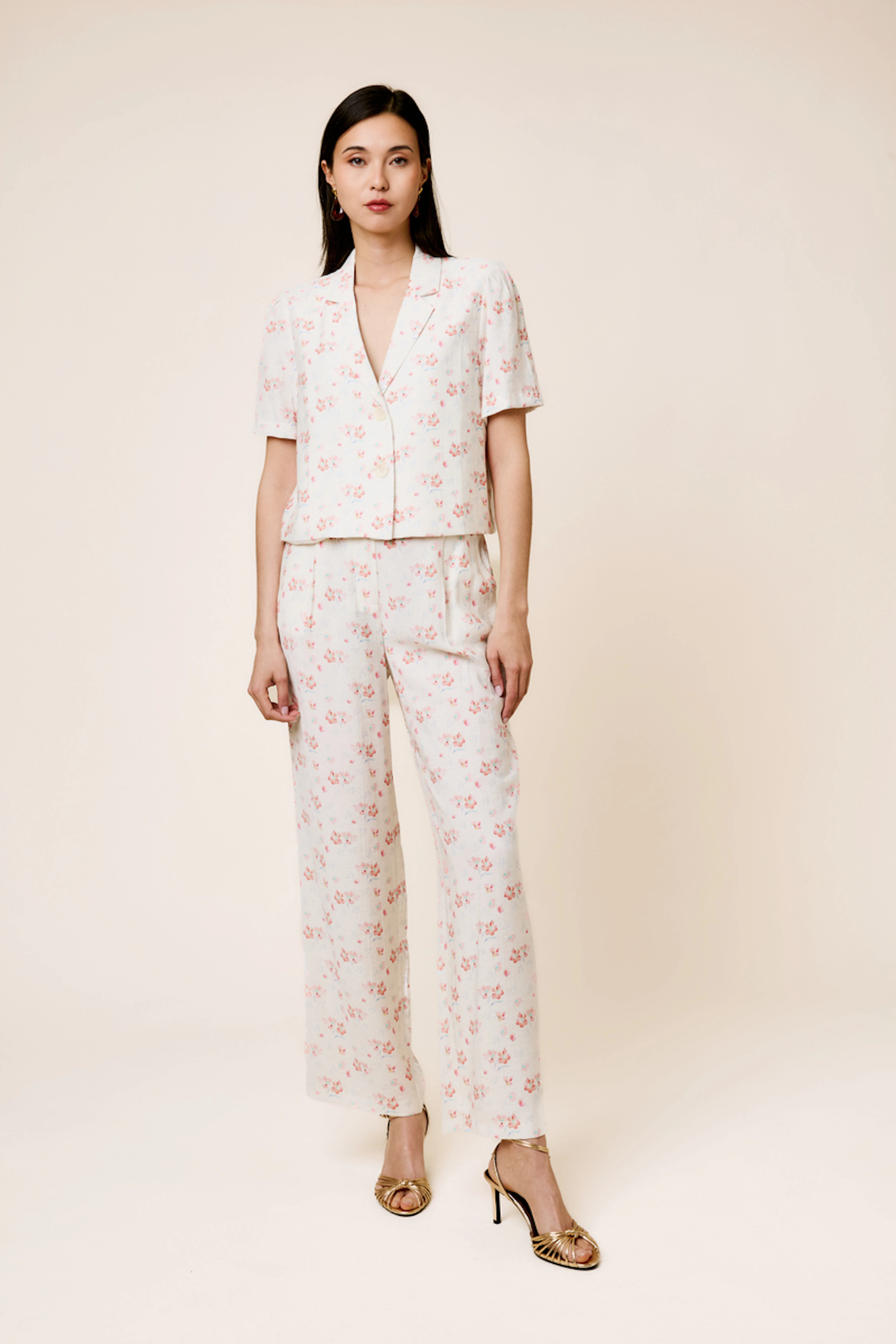 Combineer deze broek met een gekleurd top en sandalen voor een frisse en elegante zomerse look. Ideaal voor een stadswandeling. • Gemotiveerde broek • Ruime pasvorm • Hoge taille • Maxi-lengte • Bloemenprint