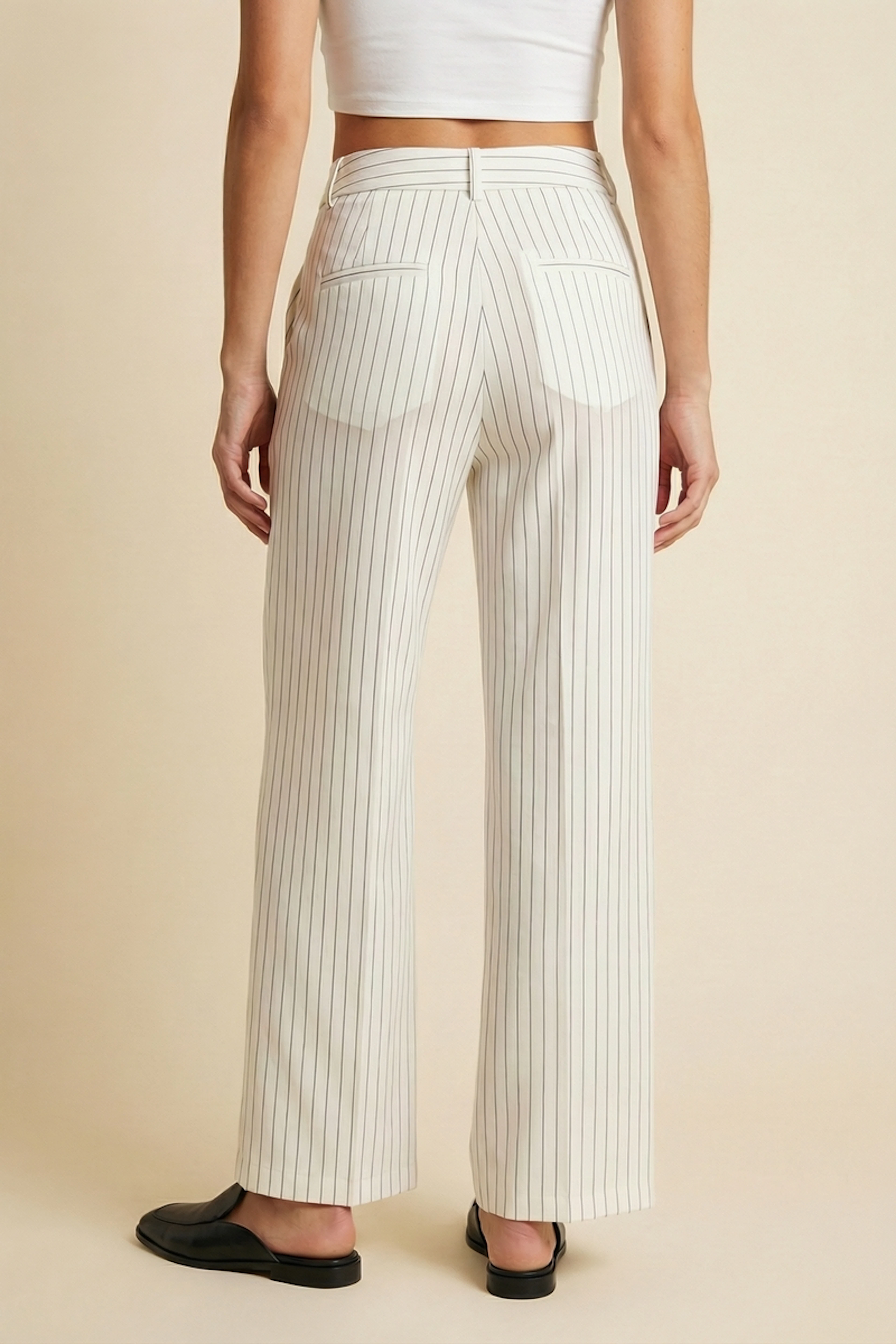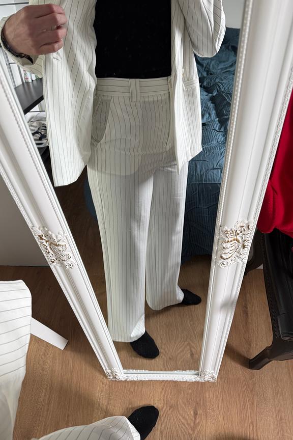 Combineer deze broek met een luchtig overhemd en hakken voor een chique en verfijnde zomerse look. • Gestreepte broek • Rechte snit • Hoge taille • Haaksluiting aan de voorkant • Decoratieve knopen
