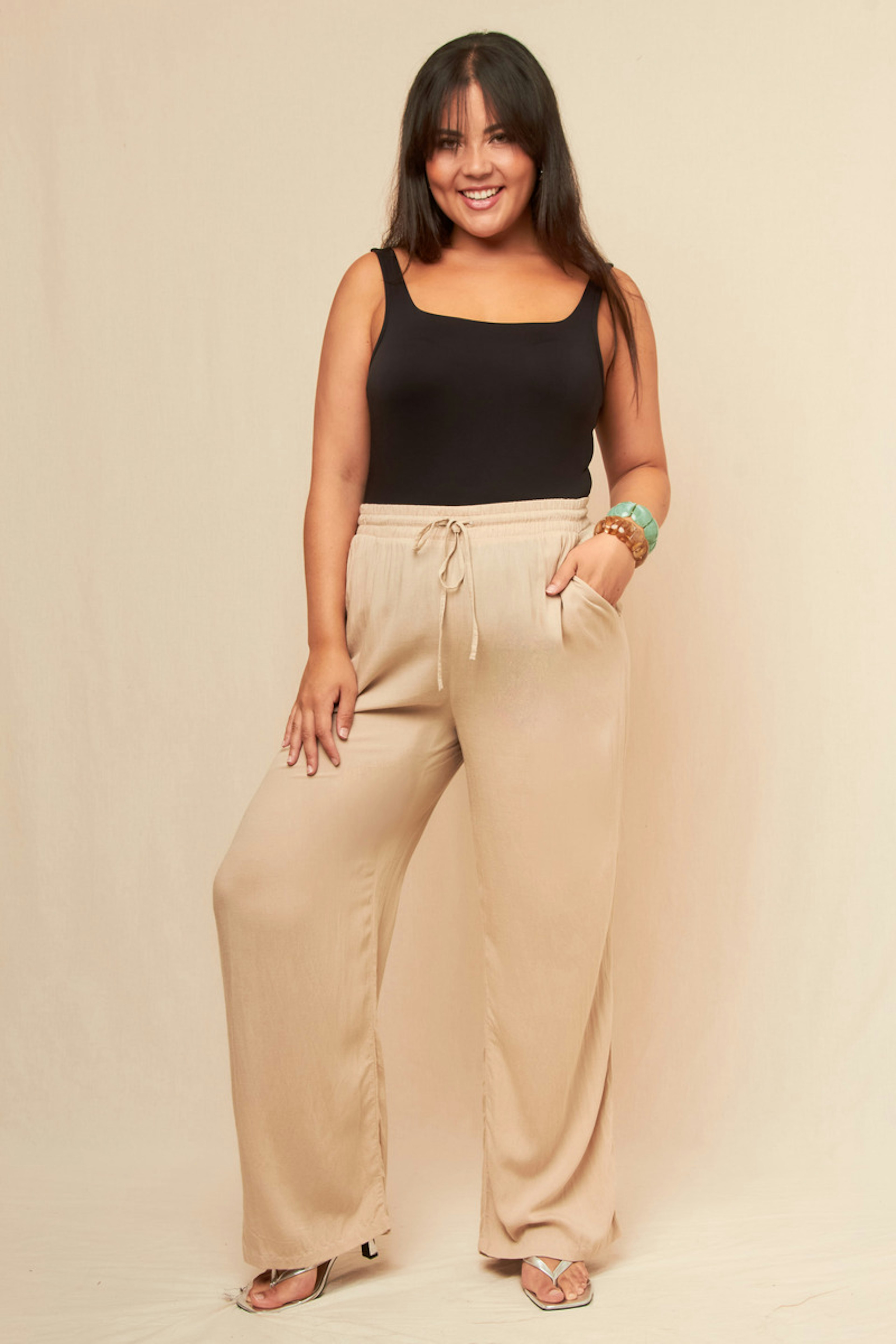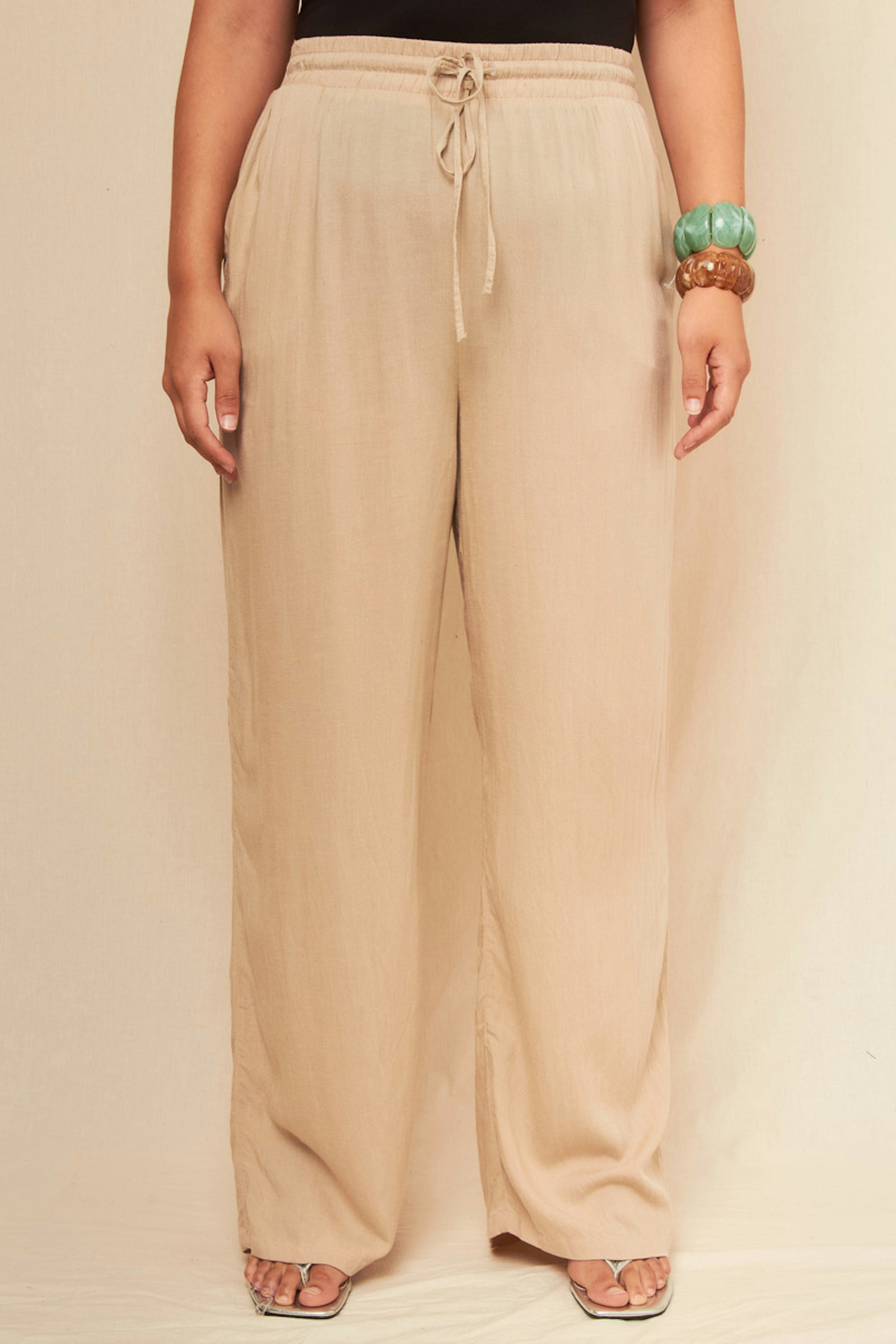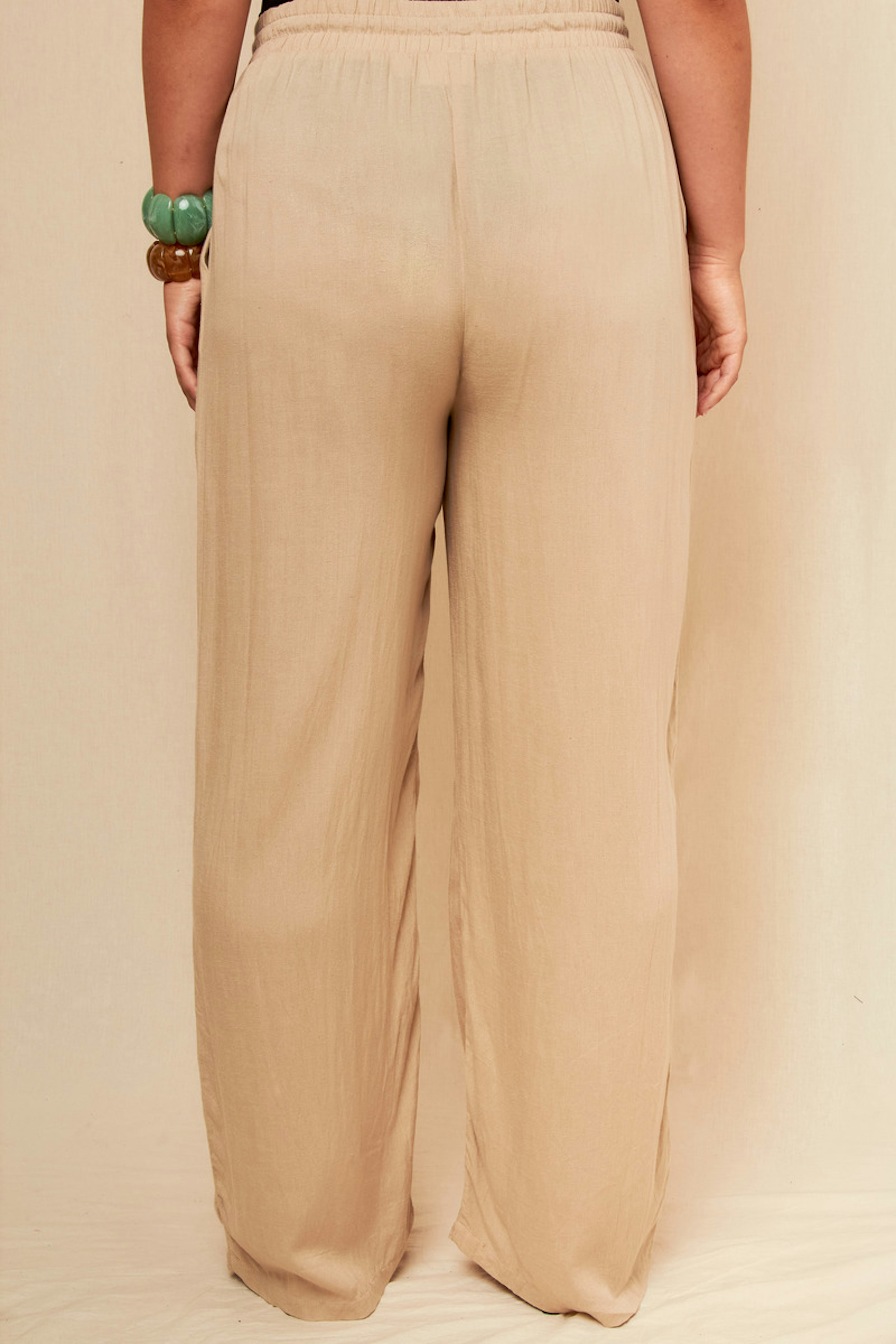 Combineer deze luchtige broek met een kanten top voor een chique zomeroutfit. Voeg gouden sandalen toe voor een vleugje glamour. • Wijde broek • Elastische taille • Bindstrikken • Vloeiende snit • Lichtbeige stof