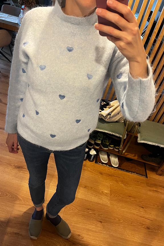 Combineer deze blauwe trui met een zwarte skinny broek en enkellaarsjes voor een chique winterlook. • Geprinte trui • Casual pasvorm • Ronde hals • Lange mouwen • Hartjespatroon