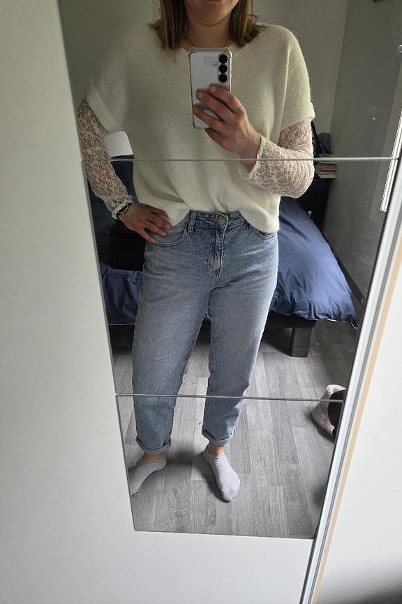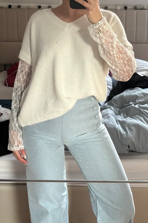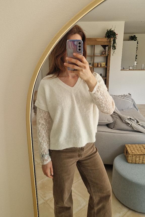 Deze trui past perfect bij een hoge taille jeans en boots voor een chique en casual look, ideaal voor een warme winter. • Trui • V-hals • Korte mouwen in kant • Aangesloten snit • Zacht en elegant