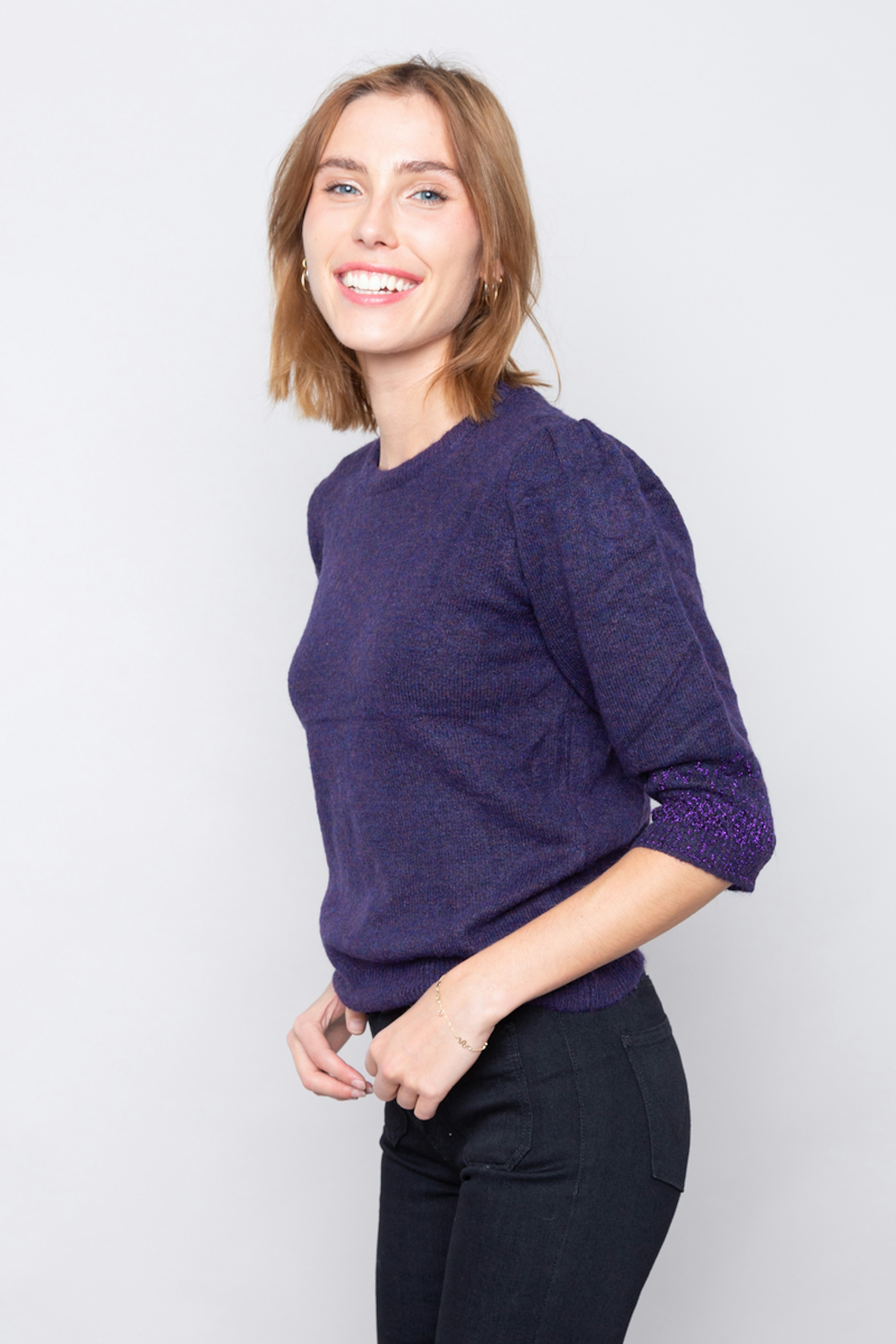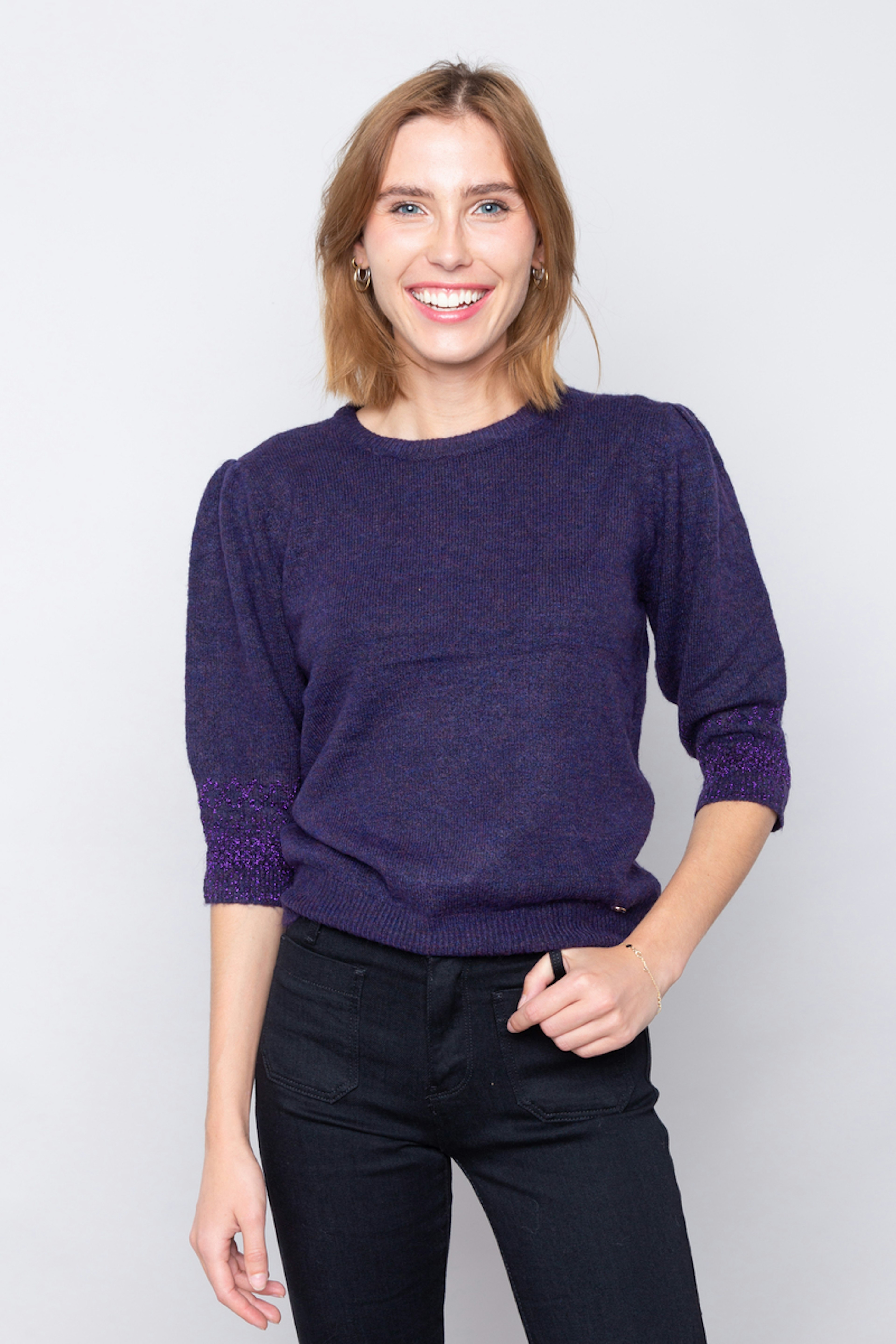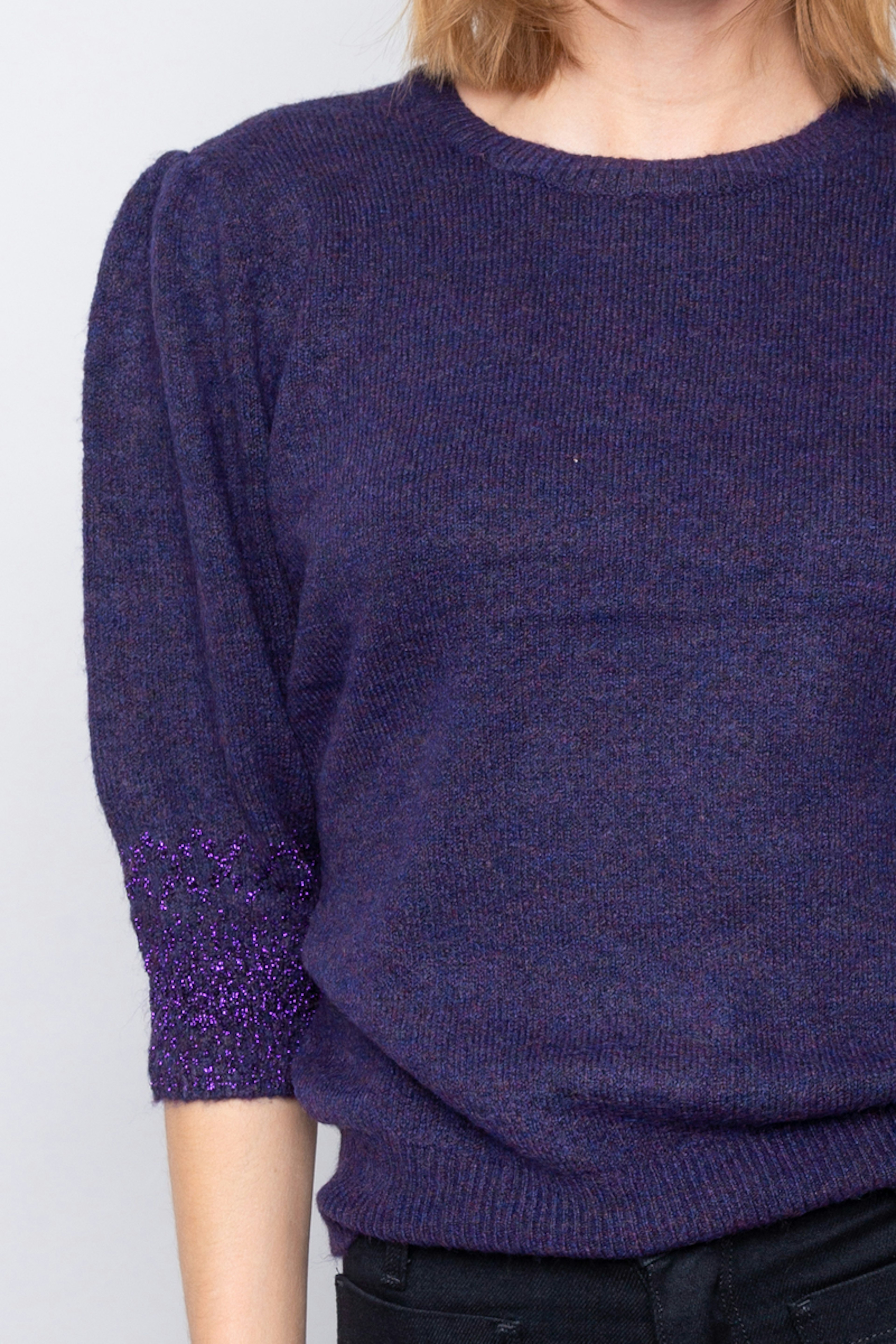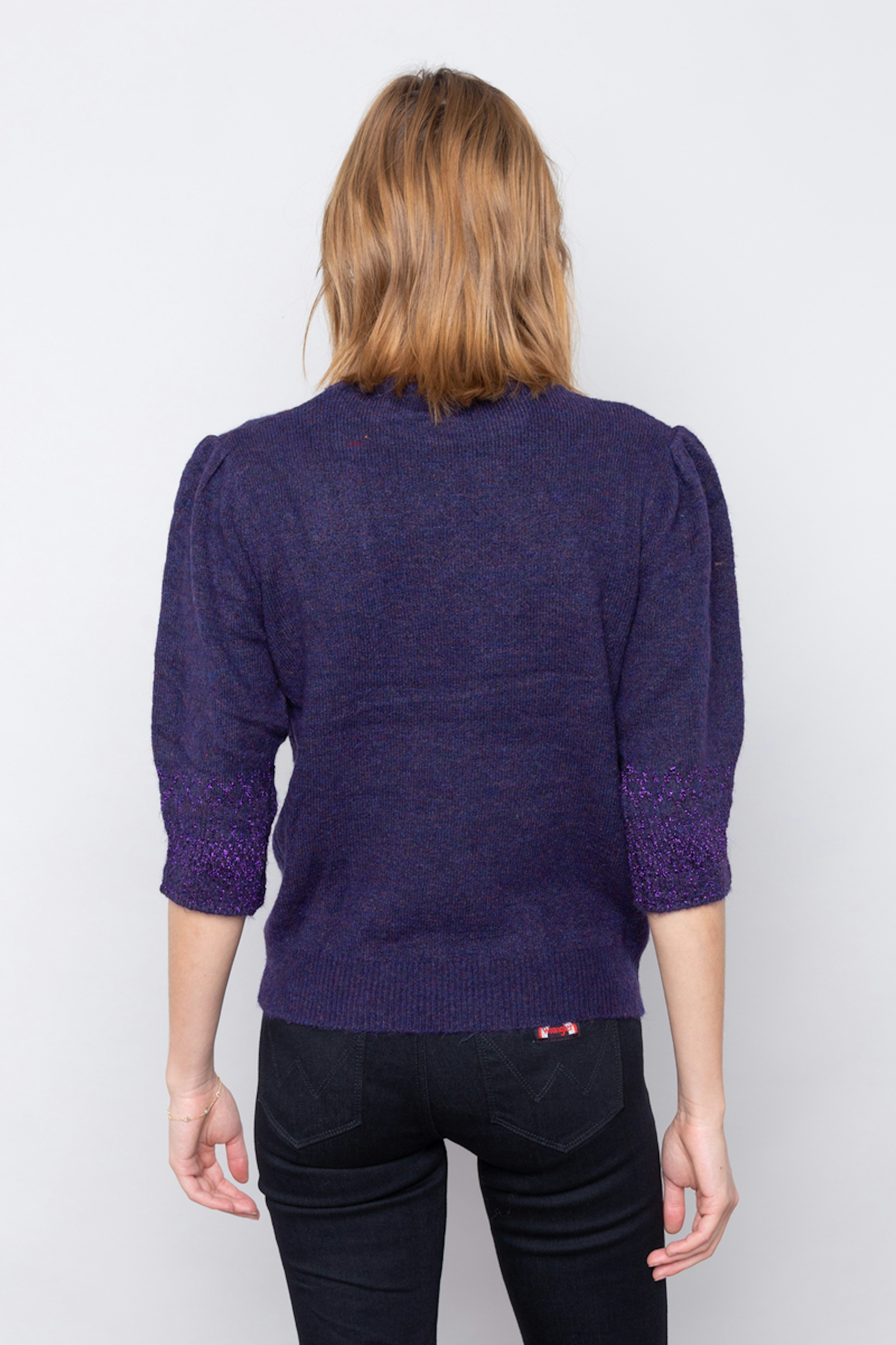 - Trui met ronde hals - Ballonmouwen - Jacquard lurex onderaan de mouwen - Rimpels op de schouders - Geribde boorden - Gegraveerd gouden LPE medaillon onderaan