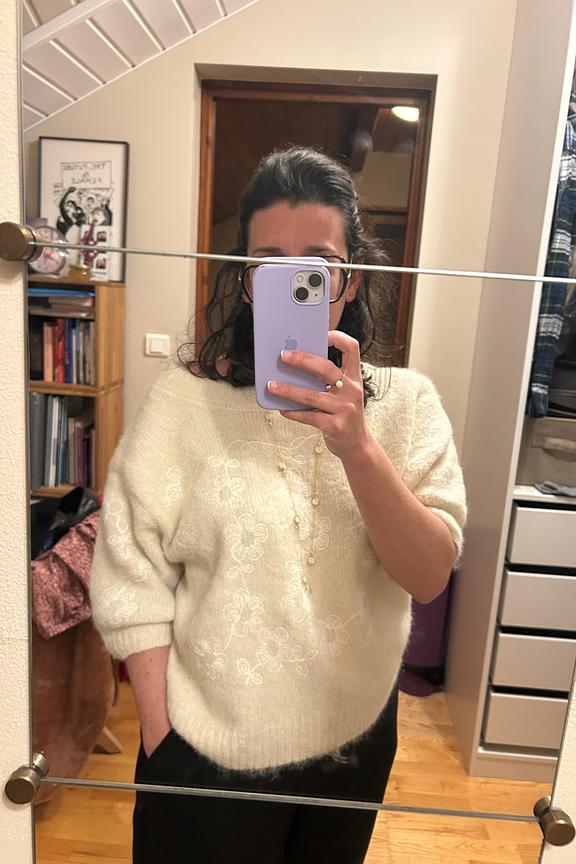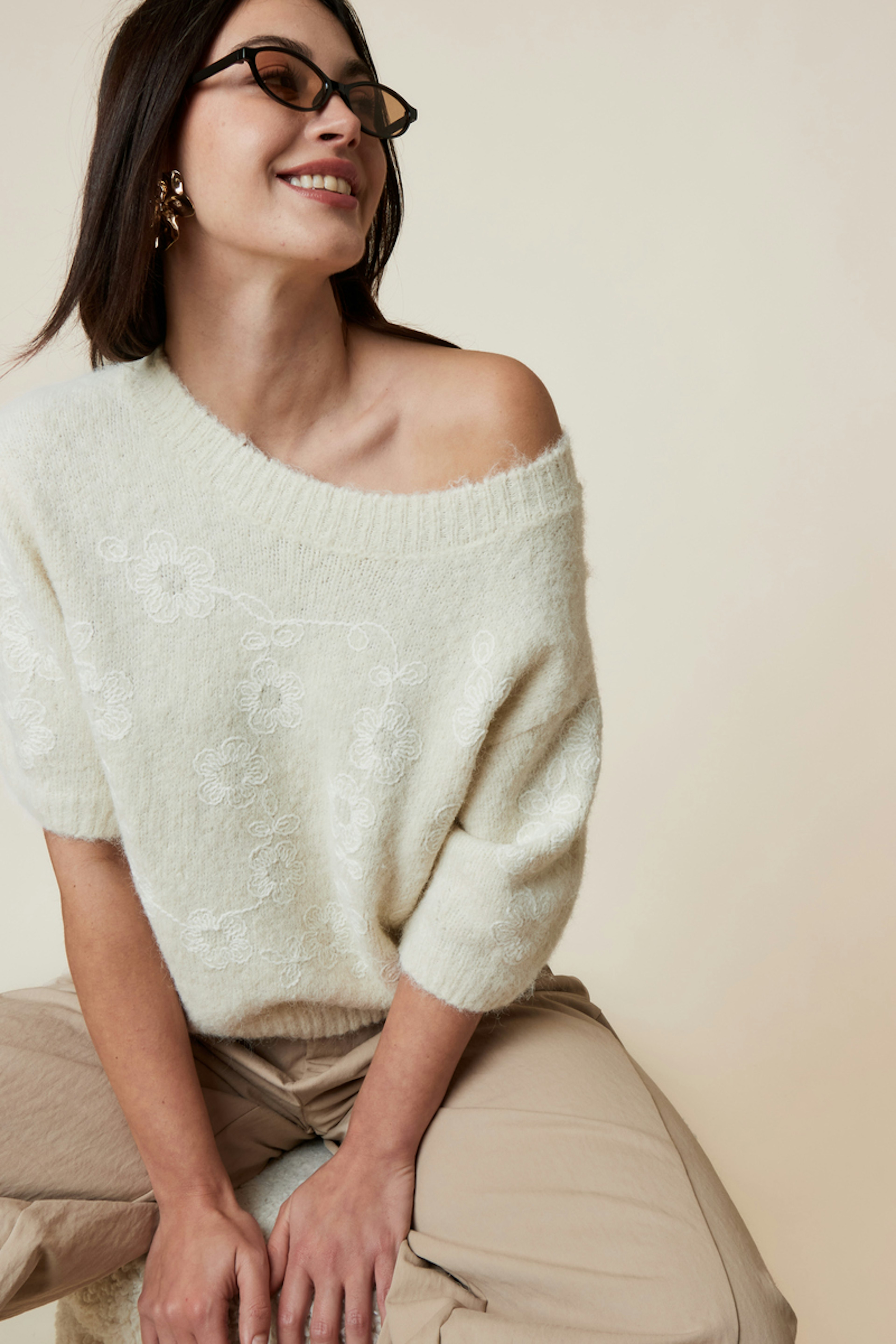 Combineer deze trui met een high waist broek voor een elegante uitstraling. Perfect voor elk seizoen. • Zachte trui met bloemenmotief • Ruime pasvorm • Vallen schouders • Driekwart mouwen • Delicaat bloemenmotief