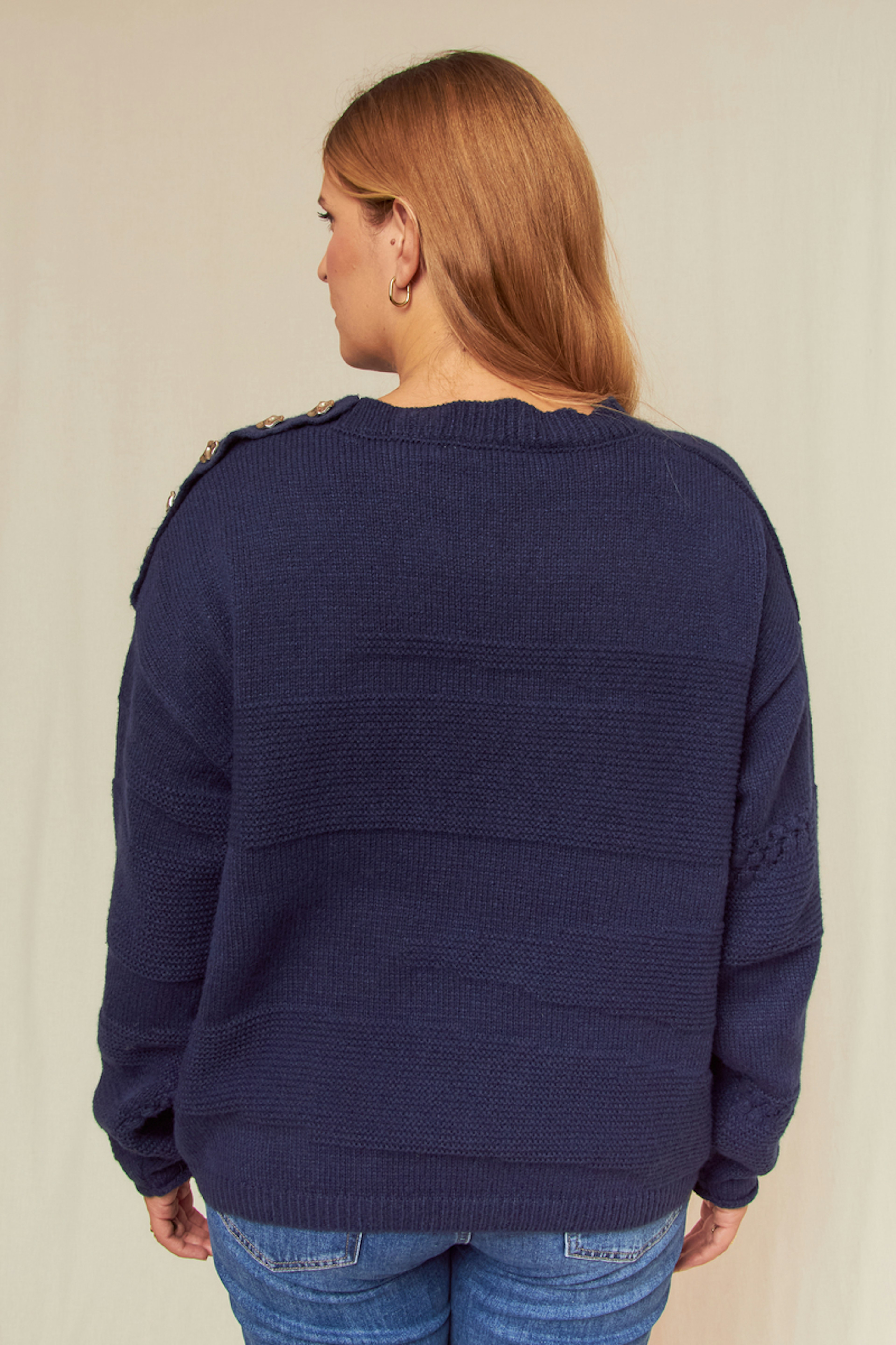 Een zachte trui om te combineren met jeans en enkellaarsjes voor een cosy winterlook. • Gebreide trui • Licht ruime pasvorm • Lange mouwen • Geknoopte schouder • Diepe blauwe kleur