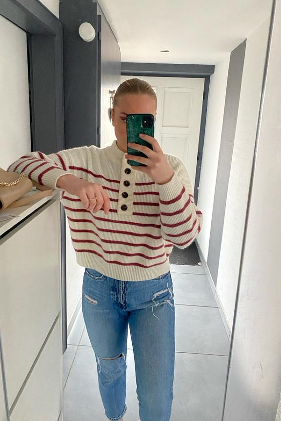 - Ecru dik gebreide trui met terracotta strepen - Bruine knopen - Hoge kraag - Comfortabel en warm voor de winter