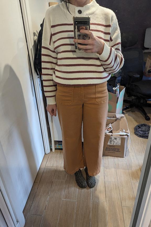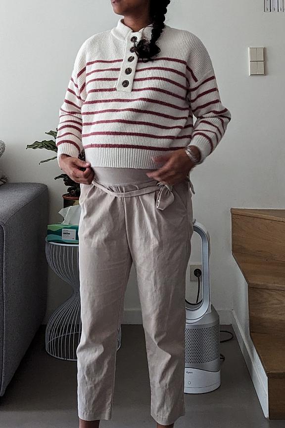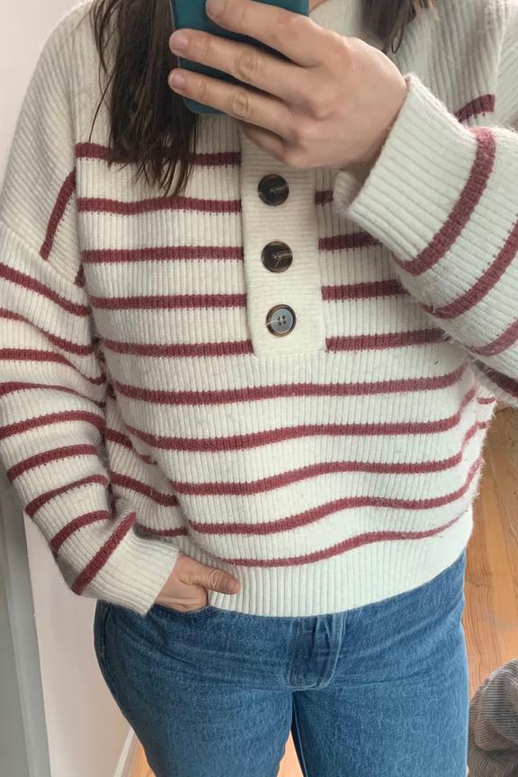 - Ecru dik gebreide trui met terracotta strepen - Bruine knopen - Hoge kraag - Comfortabel en warm voor de winter
