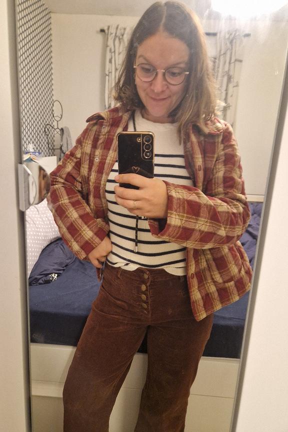 Warme trui maar de snit is erg strak. Ik droeg het met een gouden broche omdat de stijl zeer klassiek is." "
