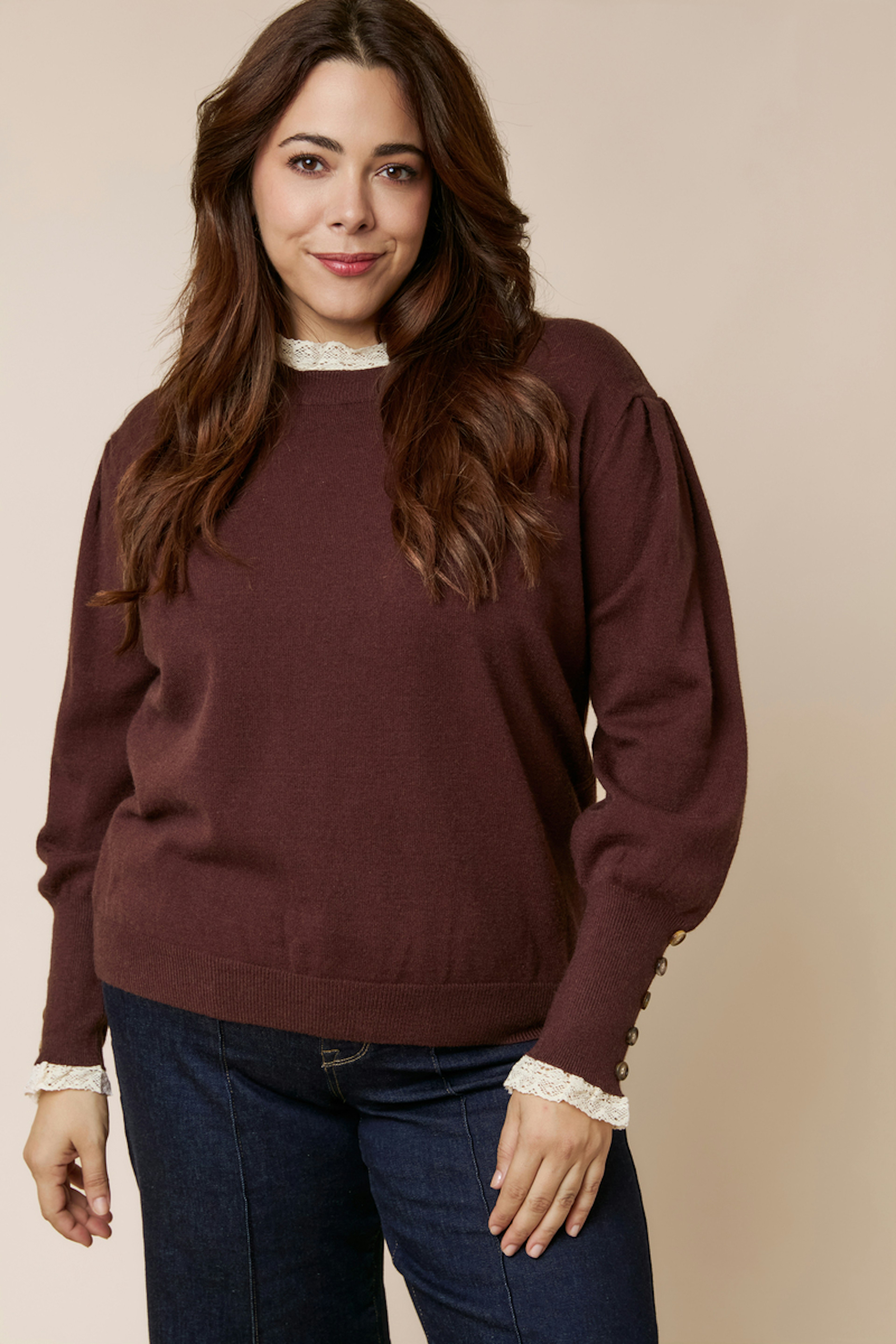 Combineer deze trui met een corduroy broek en enkellaarsjes. Perfect voor winterdagen, zijn discrete elegantie past bij al je uitjes. • Trui met lange mouwen • Lichtjes puff-schouder • Decoratieve knopen bij de pols • Klassieke ronde hals • Kantdetails bij de polsen