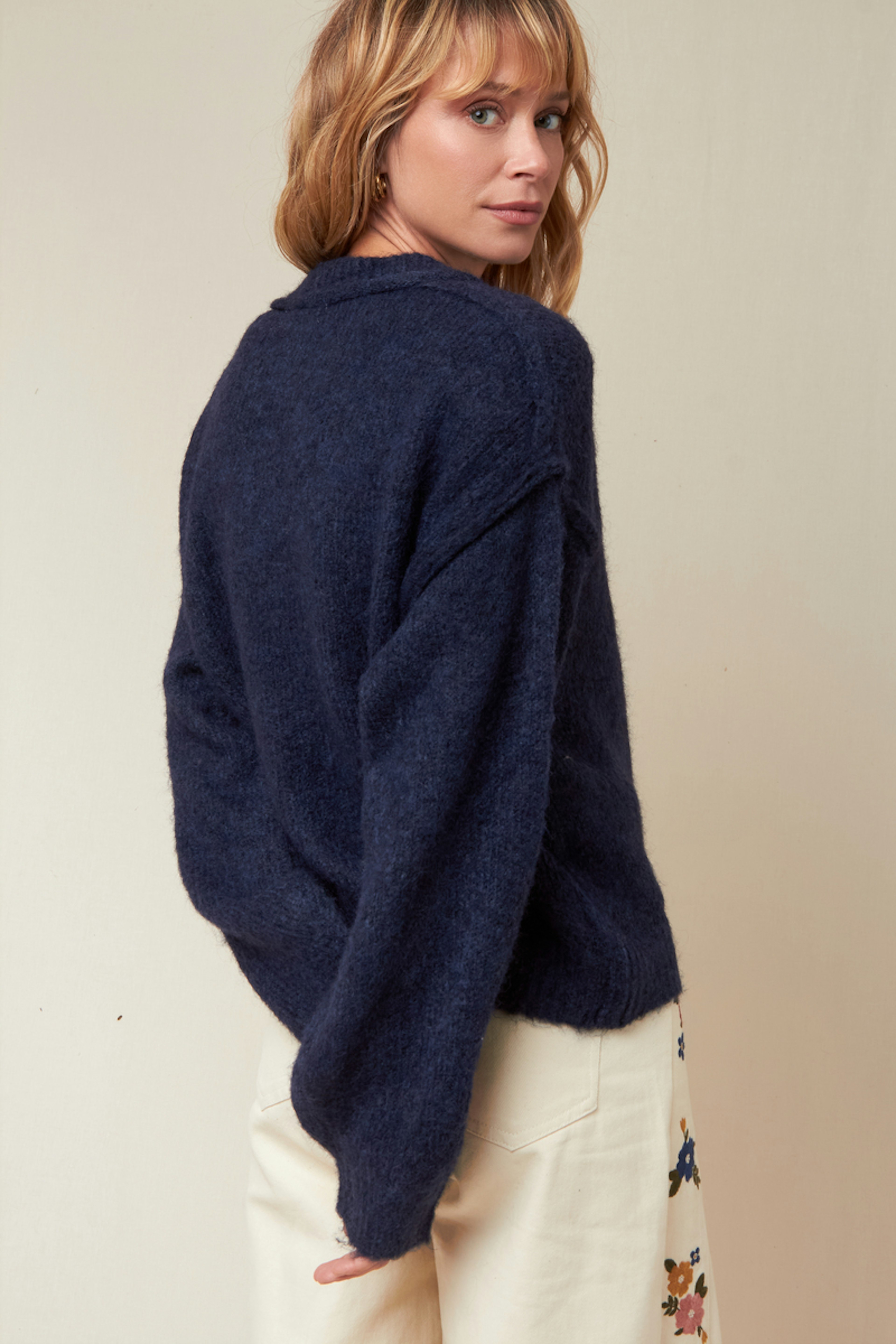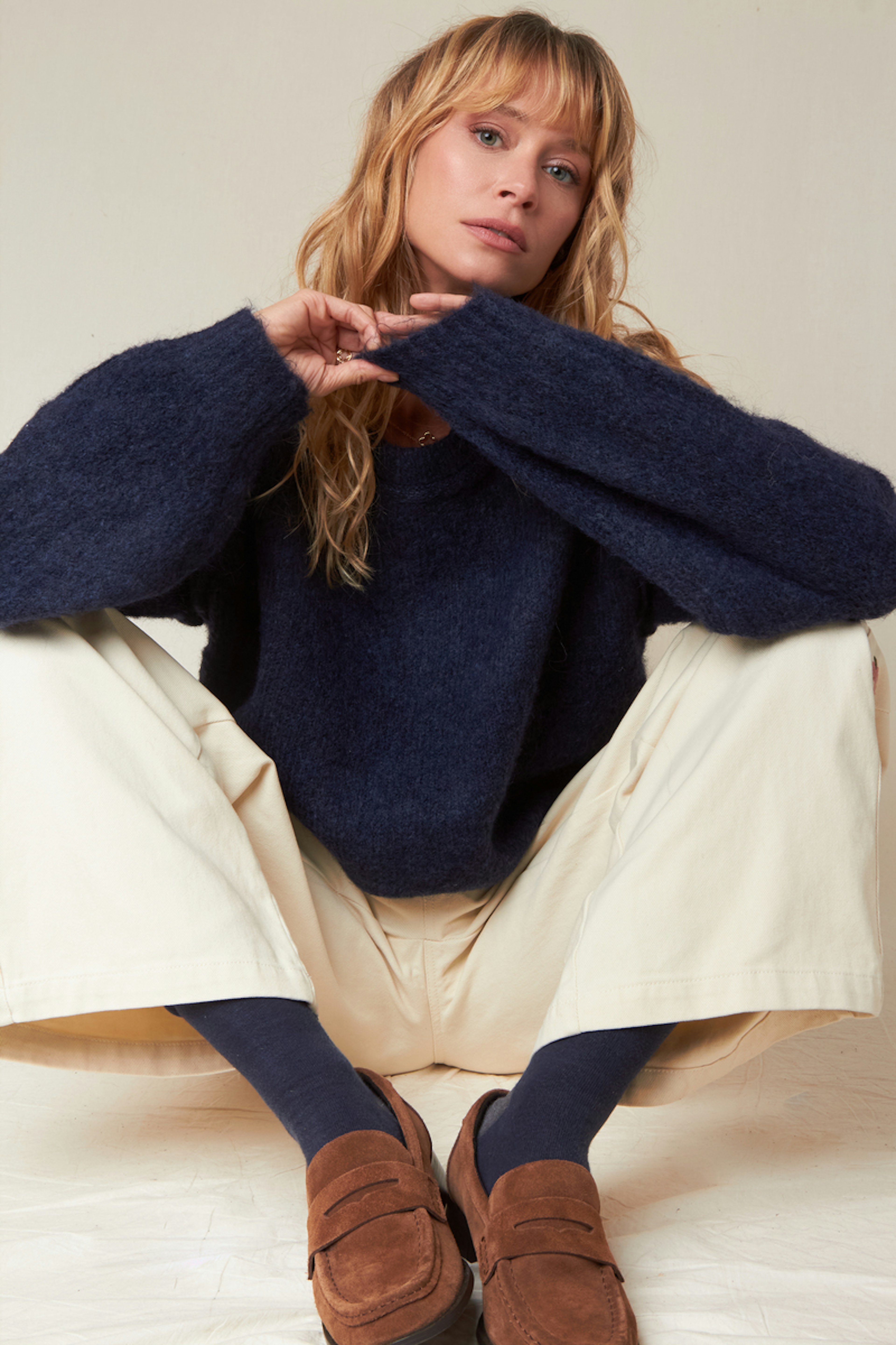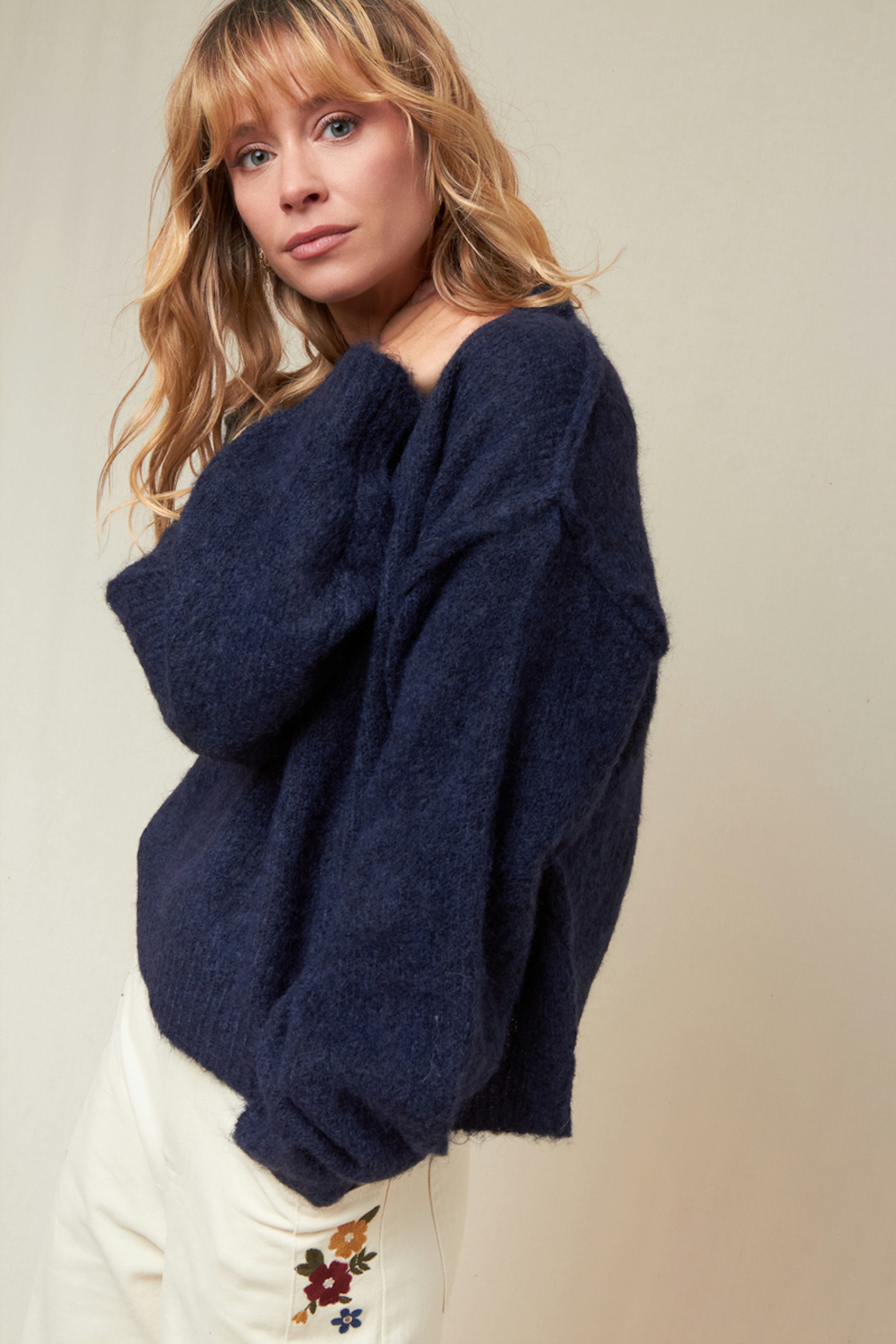 Combineer het met een hoge taillebroek en enkellaarsjes voor een chique en casual winterlook. • Ruime trui • Generous lange mouwen • Klassieke ronde hals • Zachte en pluizige textuur • Diepblauwe kleur