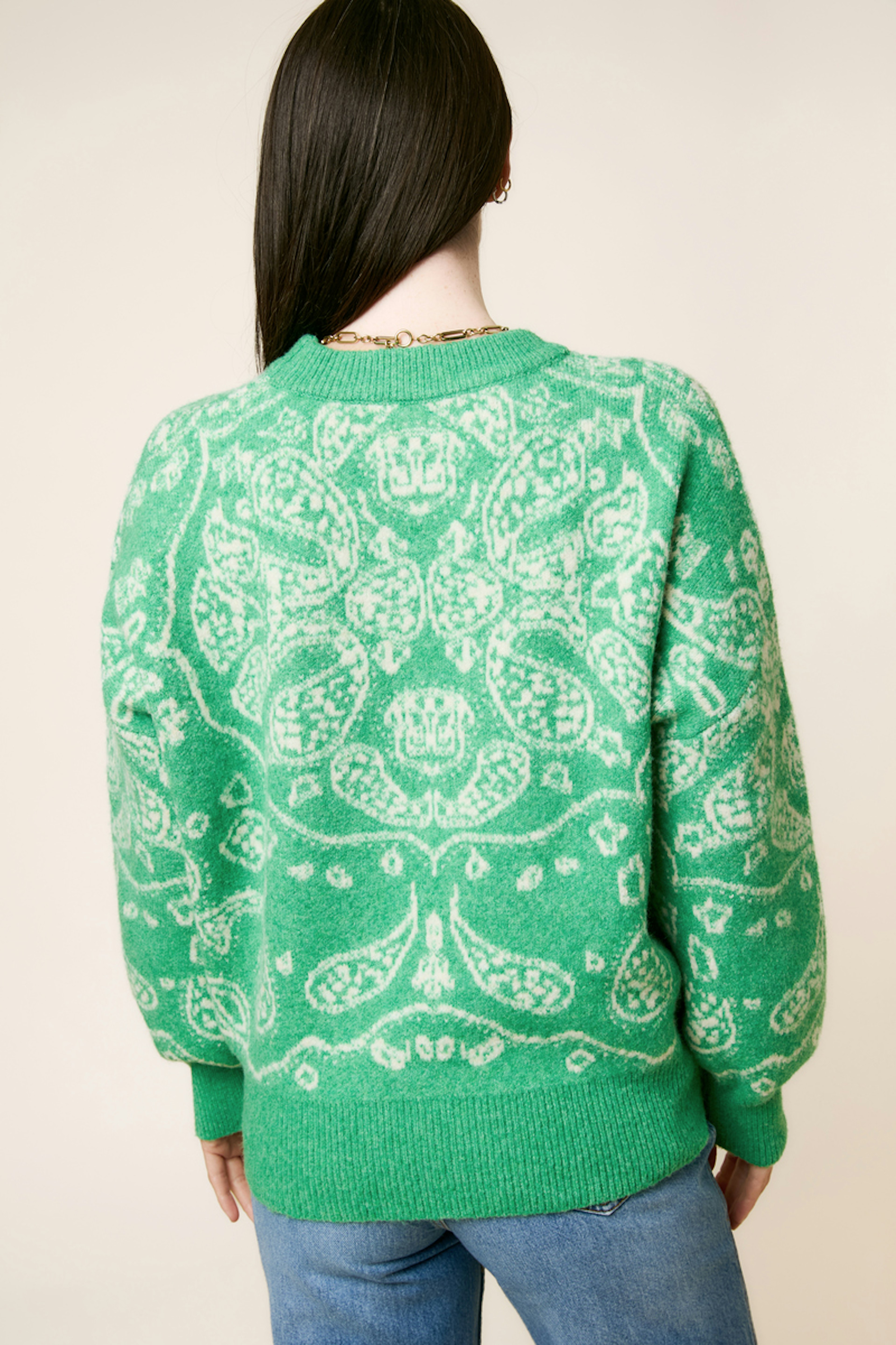 Combineer deze trui met een high-waisted jeans en enkellaarsjes voor een chique en comfortabele look, perfect voor frisse winterdagen. • Ruime trui • Ronde hals • Lange mouwen • Paisleypatroon • Geribbelde manchetten