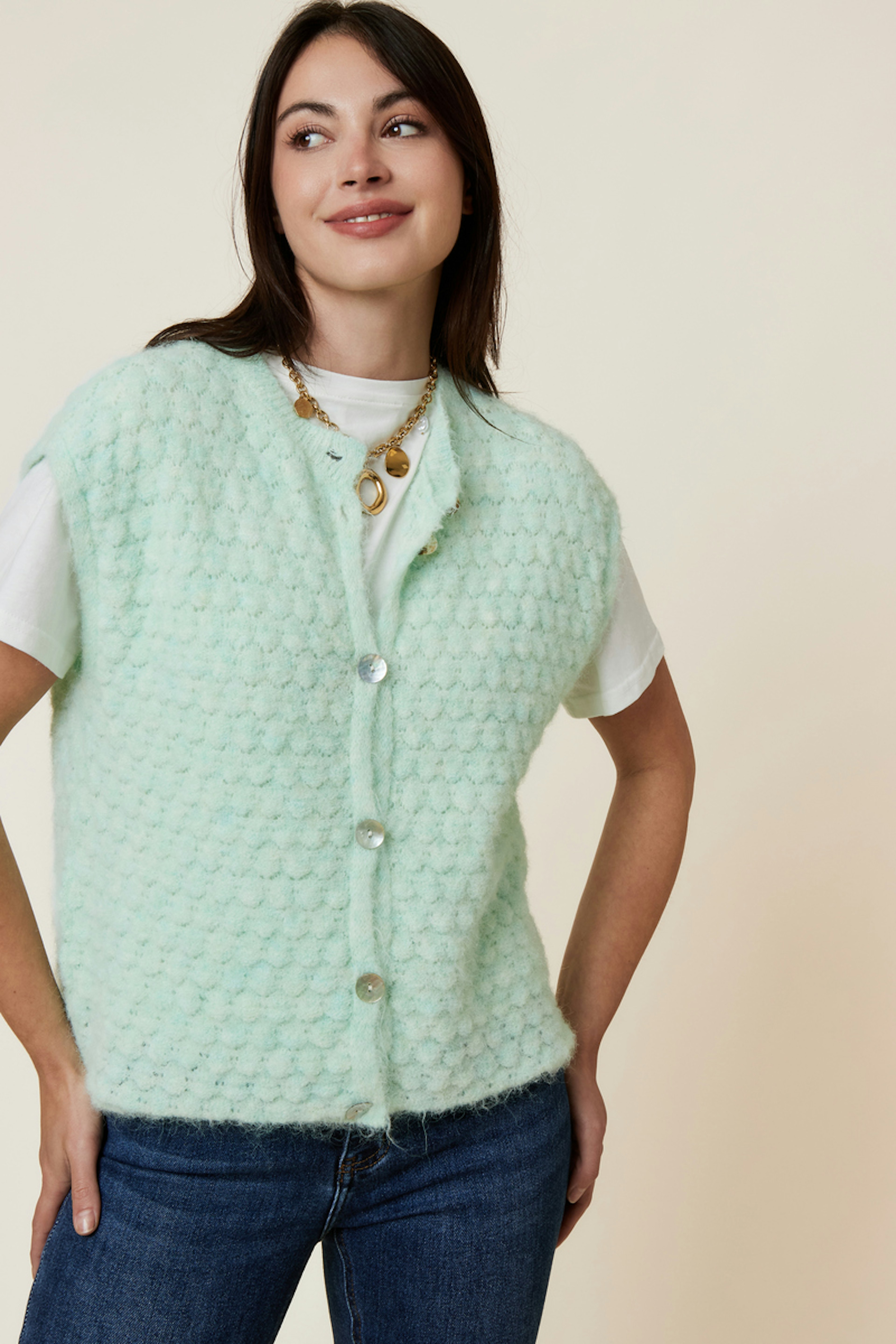 Dit vest in een stralende groene kleur is perfect over een witte blouse of een coltrui voor een chique en casual stijl. Voeg gouden accessoires toe voor een elegante touch. • Zachte gebreide vest • Casual rechte pasvorm • Korte uitlopende mouwen • Klassieke knopen sluiting • Relieftextuur