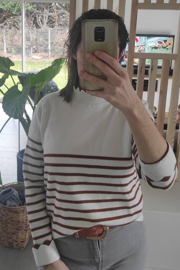 - Marnière trui - Hoge kraag - Geschulpte details op kraag en manchetten - Lengte (maat S/M): 64,5cm