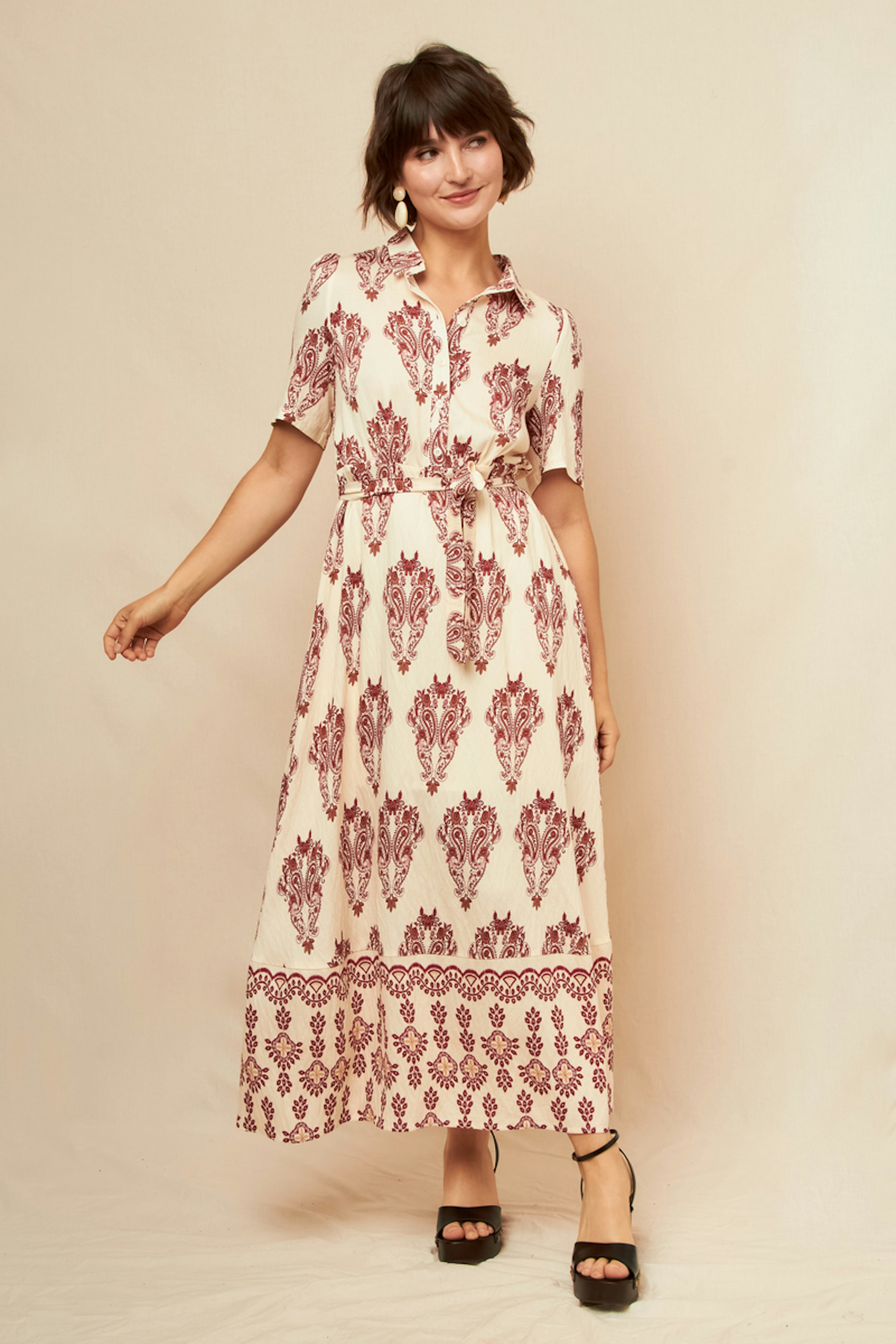 Voeg minimalistische sandalen en een strooien hoed toe om de zomerse essentie vast te leggen. - Lange jurk - Hemd model - Korte mouwen - Bloemenprint - Strikceintuur