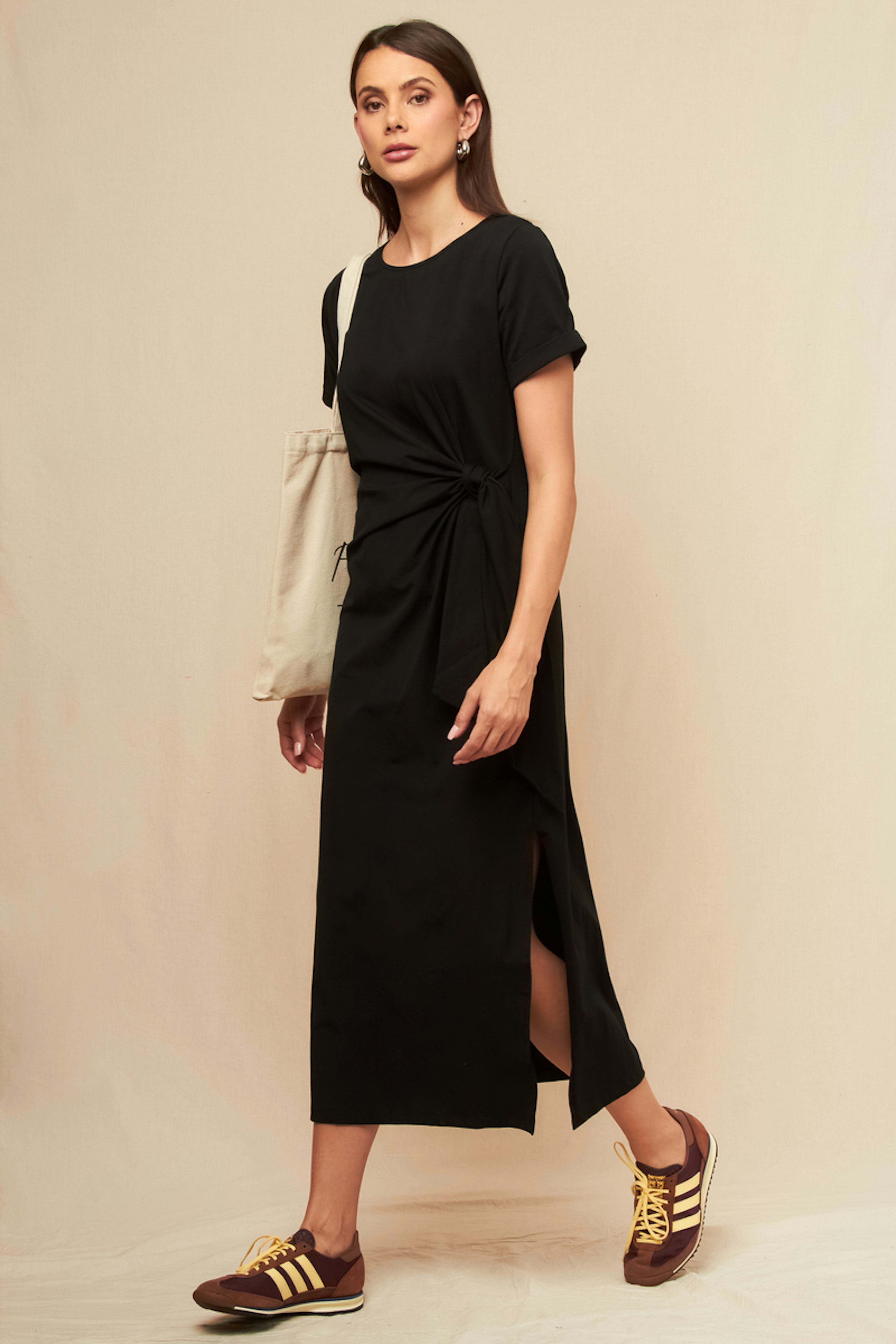 Voeg een vleugje chic toe met gouden sandalen en opvallende sieraden. Perfect voor de zomer! - Katoenen maxi-jurk - Korte mouwen - Strik in taille - Ronde halslijn - Discrete split opzij