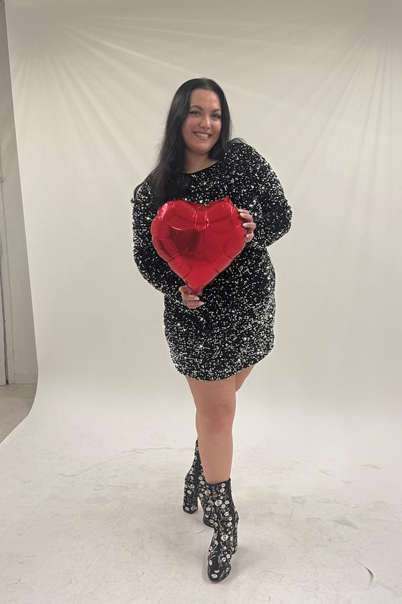 Voor een glamour met pure eenvoud, combineer het met zilveren hakken en een chique clutch. Perfect voor de winteravonden. • Korte, aansluitende jurk • Lange mouwen • Ronde halslijn • Stoffen met pailletjes • Discrete sluiting aan de achterkant