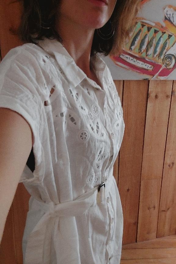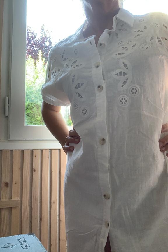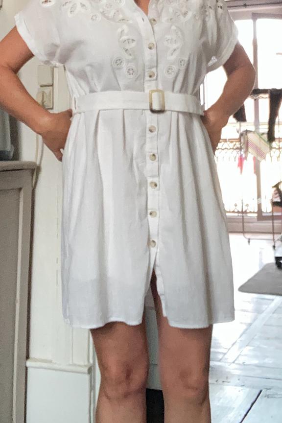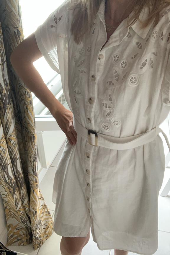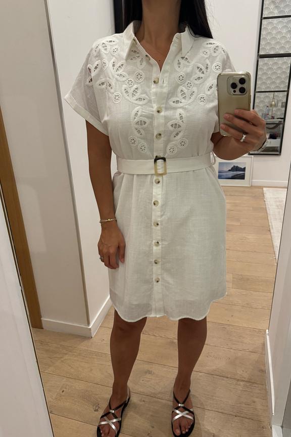 Voor een verfijnde zomerlook combineer je deze jurk met leren sandalen en een strooien hoed. Ideaal voor zonnige dagen en casual avonden. - Korte katoenen jurk - Klassieke overhemdkraag - Korte mouwen - Opengewerkt borduursel - Afneembare tailleband - Knoopsluiting aan de voorkant