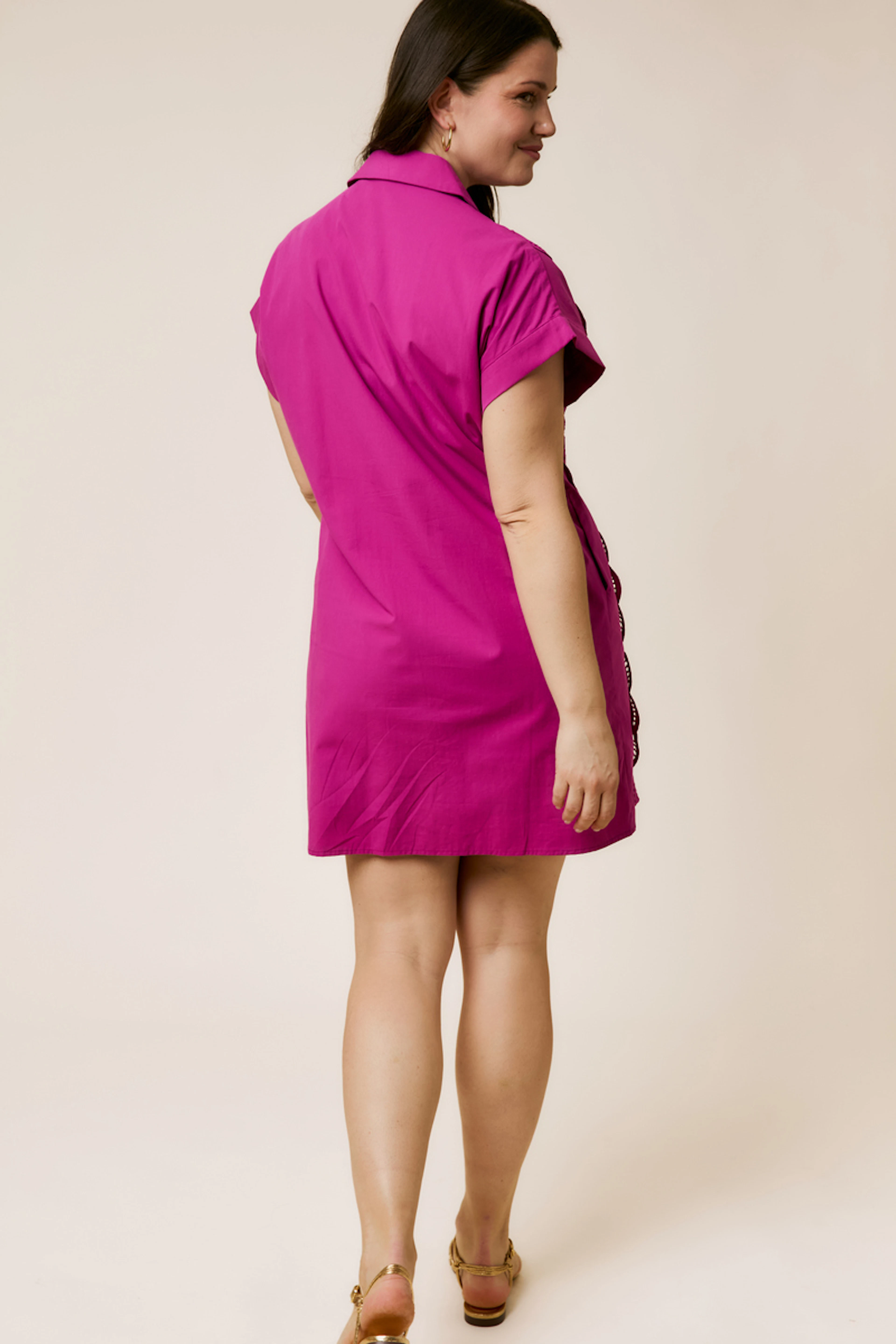 Combineer deze jurk met gouden sandalen en een rieten tas voor een chique en comfortabele zomerse uitstraling! • Katoenen overhemd jurk • Vloeiende rechte snit • Klassieke overhemdkraag • Korte mouwen • Patroon van Engelse broderie
