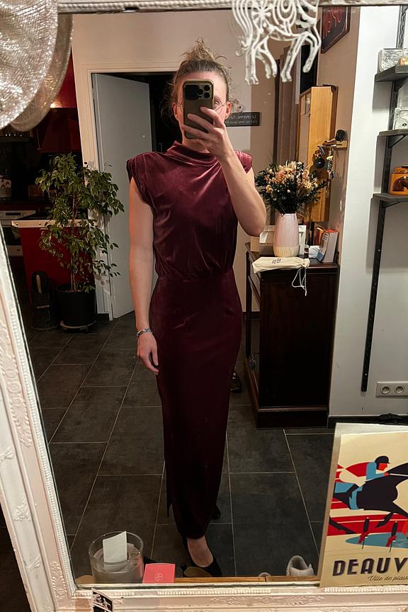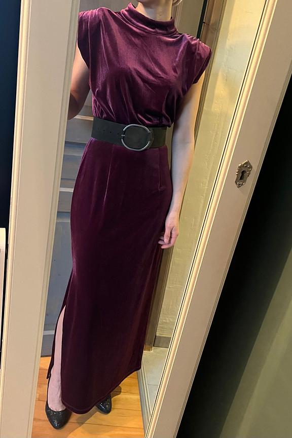 Combineer deze fluwelen maxi-jurk met zwarte pumps voor een geraffineerde winterlook. - Bordeaux fluwelen maxi-jurk - Hoge kraag - Mouwloos - Hoge kraag met knoopsluiting - Zijsplit - Elastische taille - Elegante epauletten - Lengte: 140 cm in maat 38