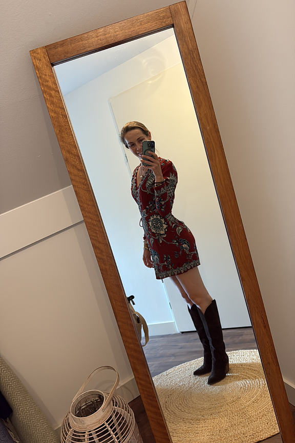 Combineer deze jurk met leren enkellaarsjes voor een chique, moderne look die perfect is voor winterse dagen. - Tropisch rode overslagjurk - V-hals - Lange pofmouwen - Korte lengte - Sluit in de taille met een strikje - Gedurfde tropische print op een sensuele rode achtergrond.