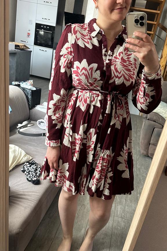 Voeg een vleugje chic toe met leren enkellaarzen en een wollen jas voor frisse winterdagen. • Jurk portemonnee • Vloeiende snit • Lange mouwen • V-hals • Gedrukte print