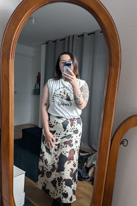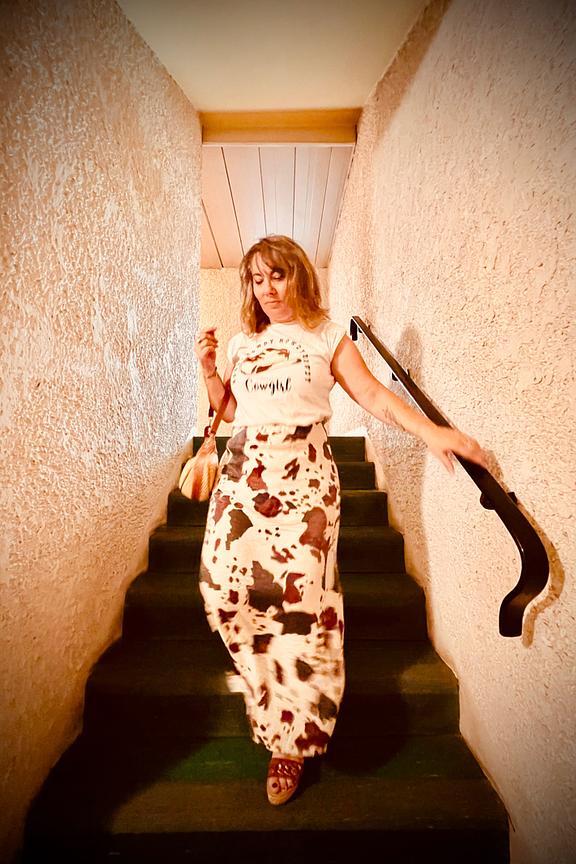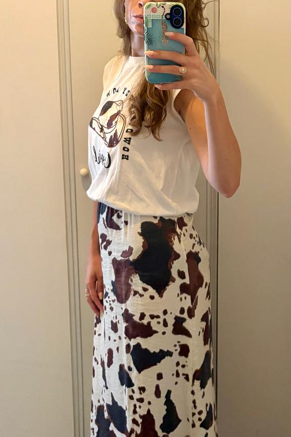 Combineer deze jurk met leren sandalen en een strooien hoed voor de perfecte zomerlook. - Katoenen maxi-jurk - Elastische taille - Korte, licht pofmouwen - Koeienprint - Ronde halslijn