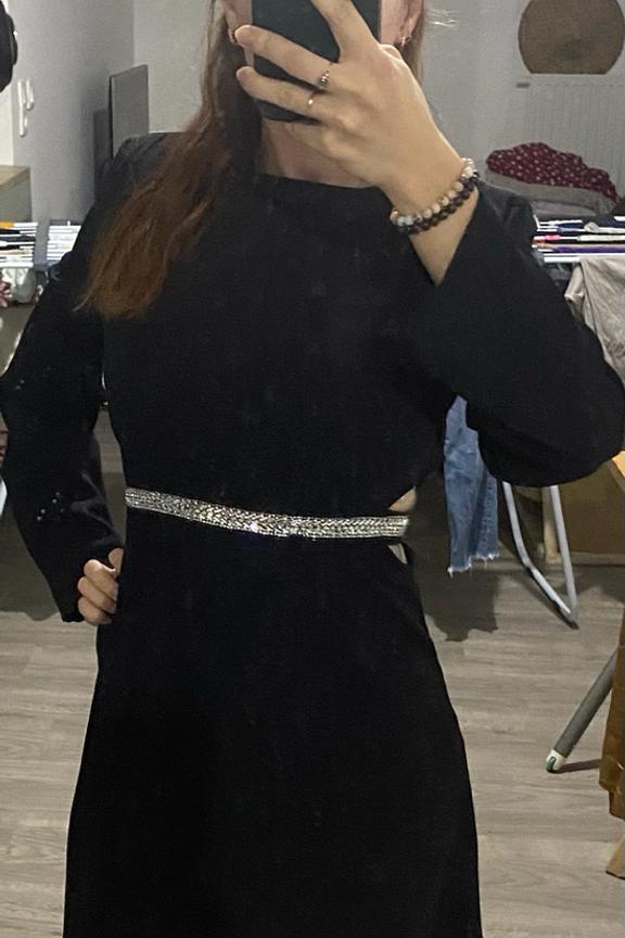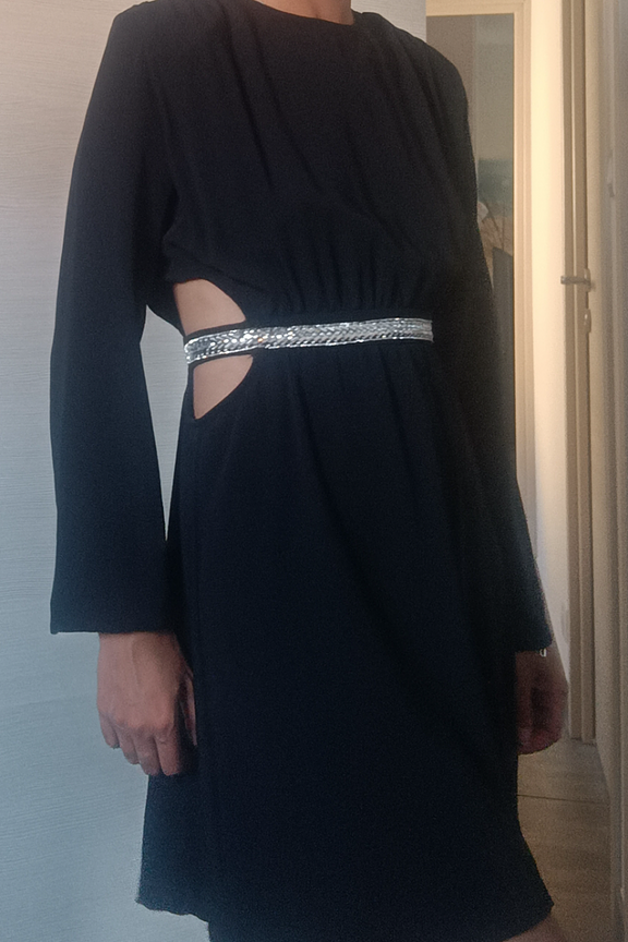 Deze zwarte Opullence jurk is een echt juweeltje voor je chique avondjes uit. Verfraai dit stuk met zilveren accessoires en hoge hakken voor een glamoureuze winterlook. - Korte jurk - Uitgesneden detail in de taille - Lange mouwen - Tailleband - Ronde halslijn