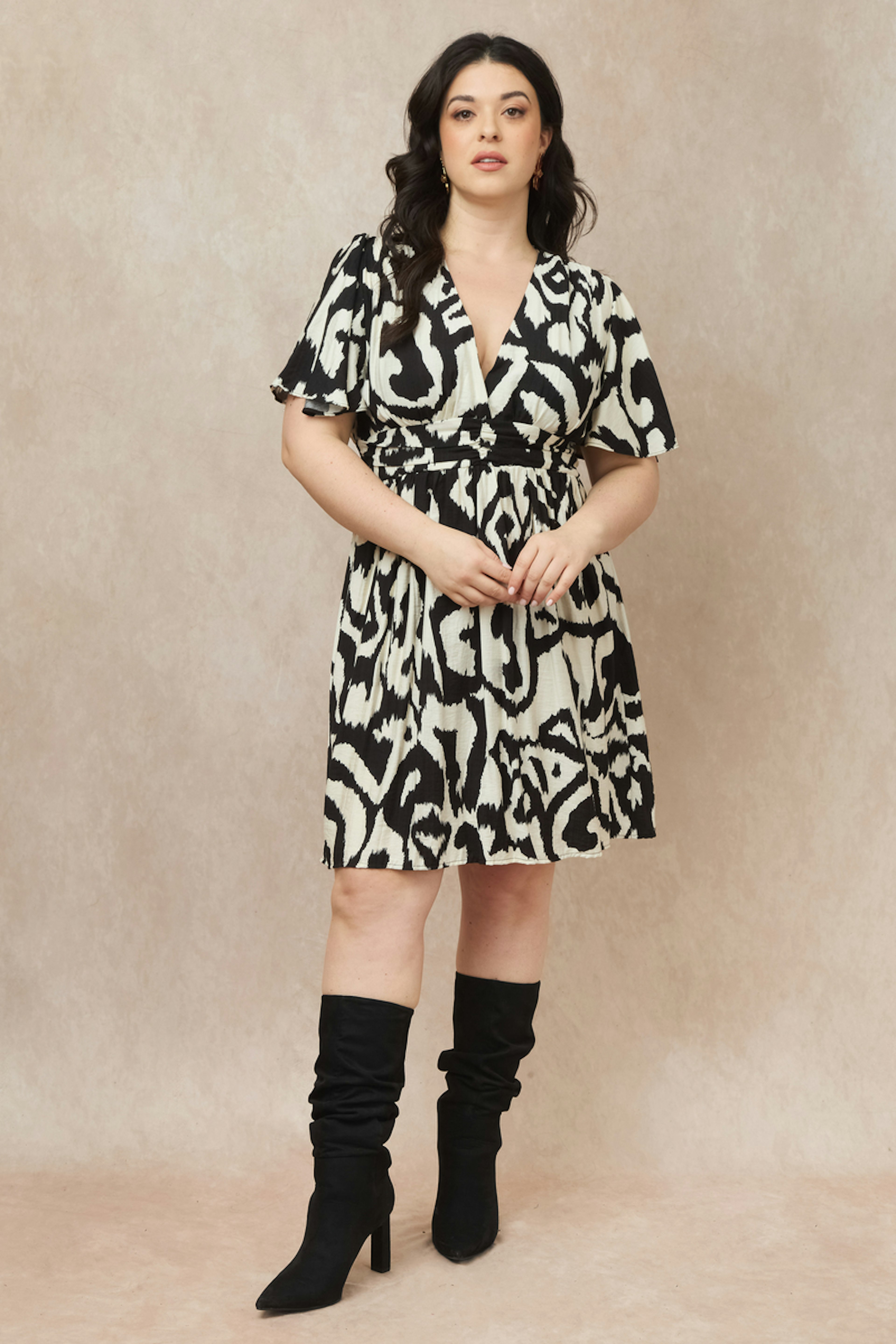 Combineer deze mooie jurk met motief met hak sandalen en een minimalistische handtas voor een stijlvol zomers uitje. Perfect voor een zonnige dag of een avondje uit met vriendinnen. - Korte jurk - V-hals - Korte uitlopende mouwen - Taille - Bedrukt motief