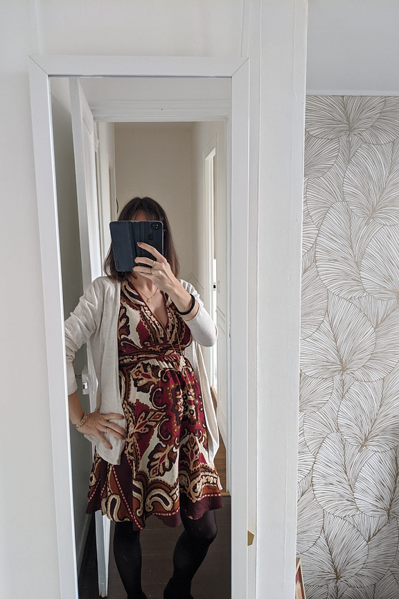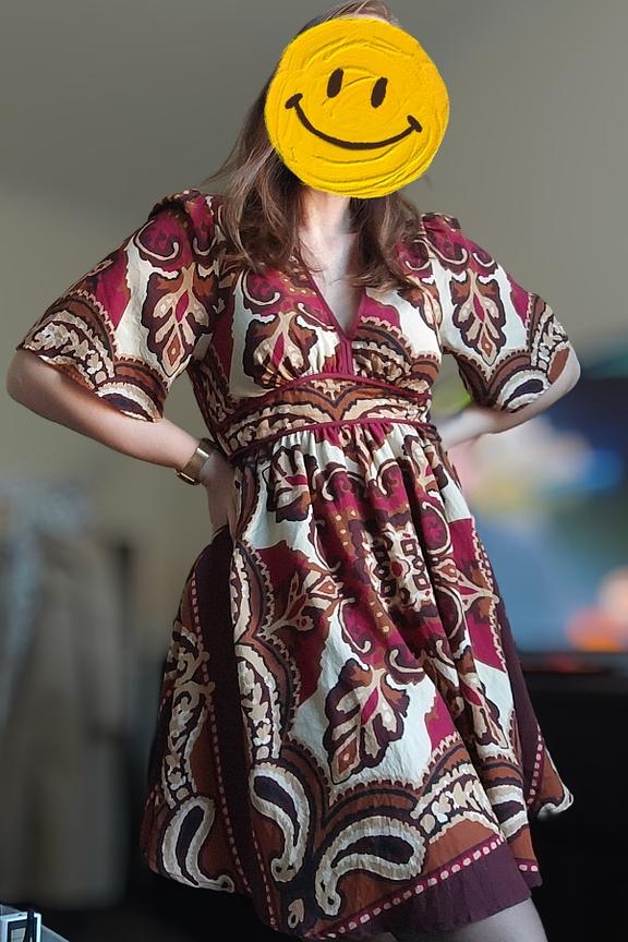 Het drukwerk is erg mooi en de jurk is erg prettig om te dragen. Perfecte lengte voor mijn kleine 1,52m😊" "