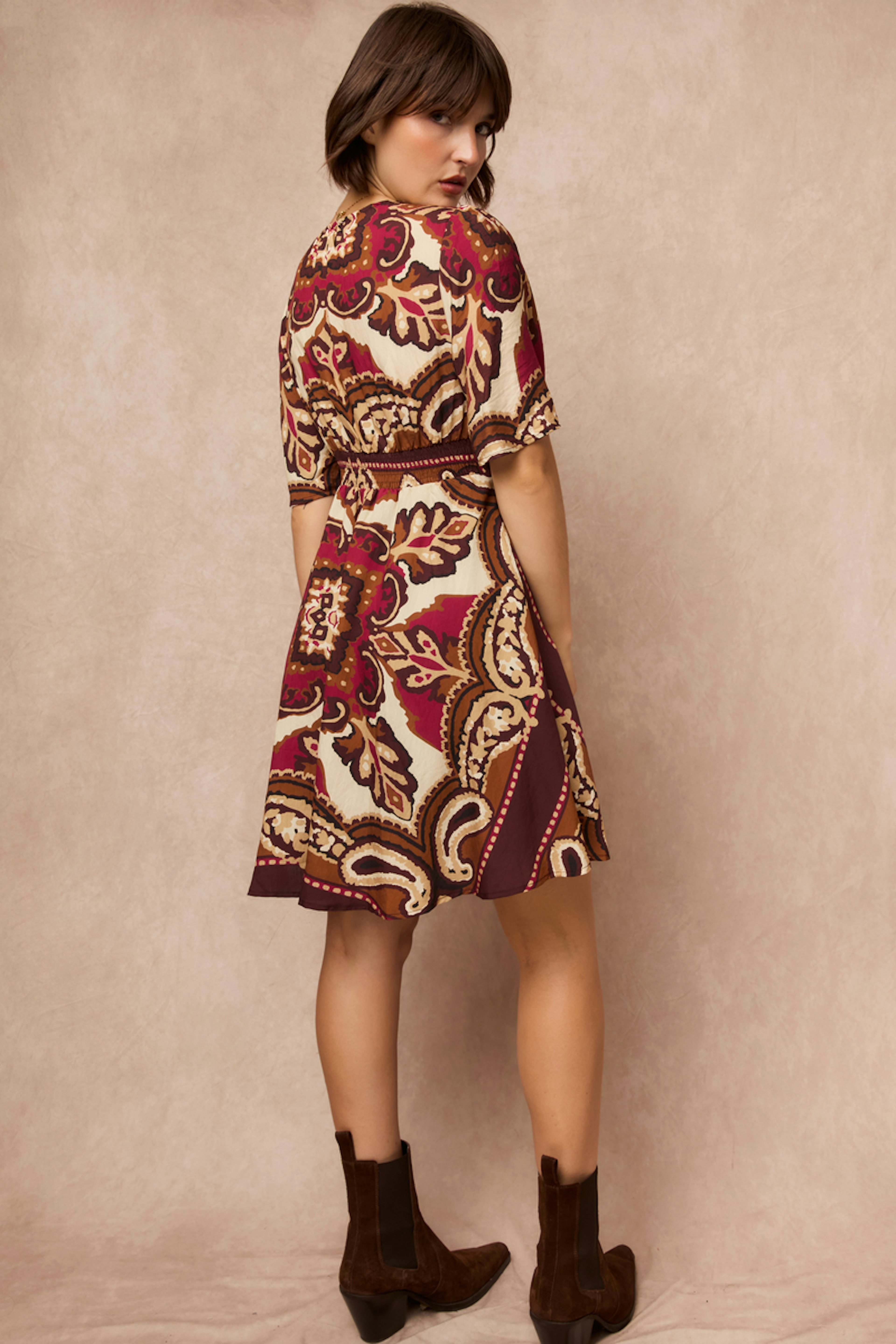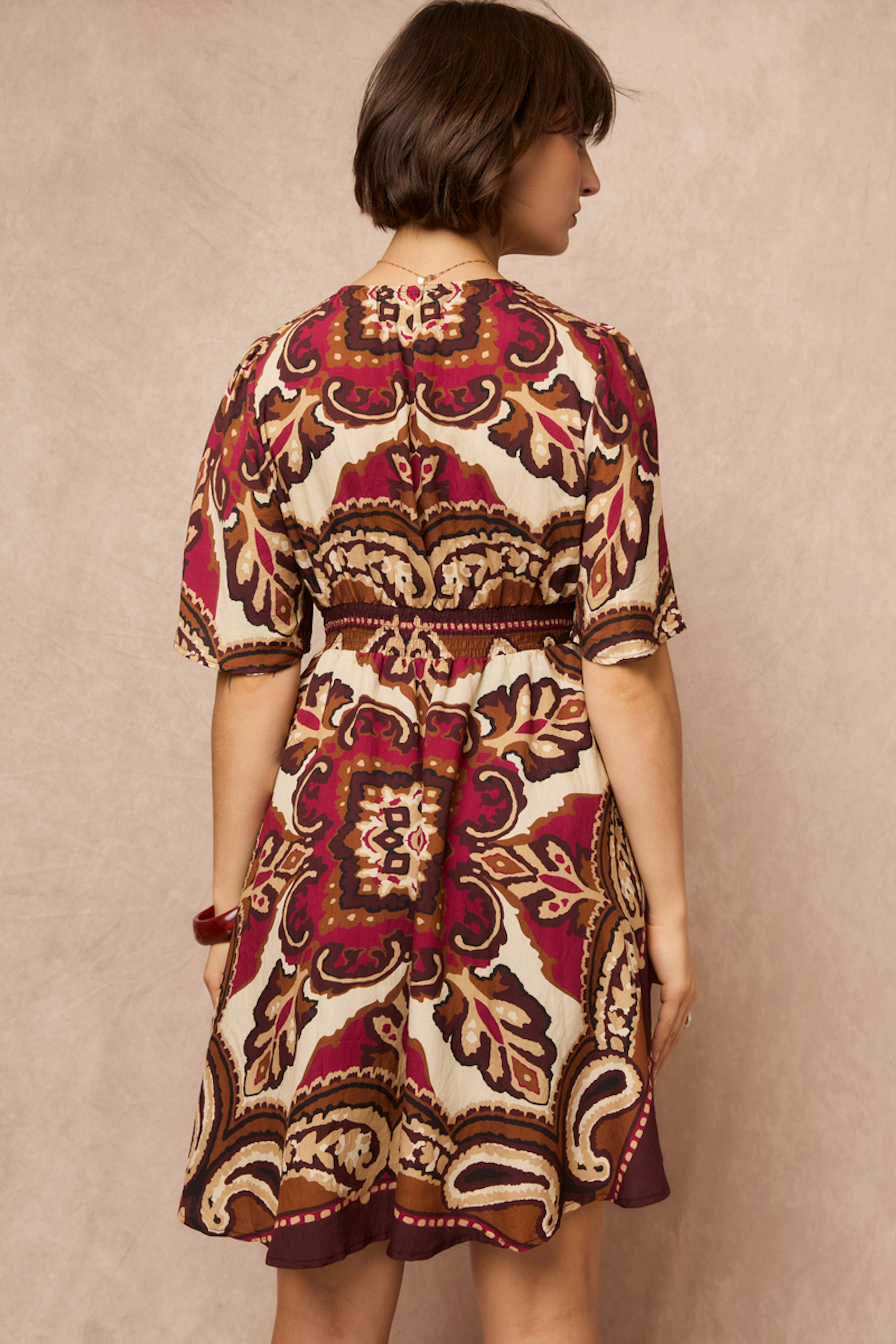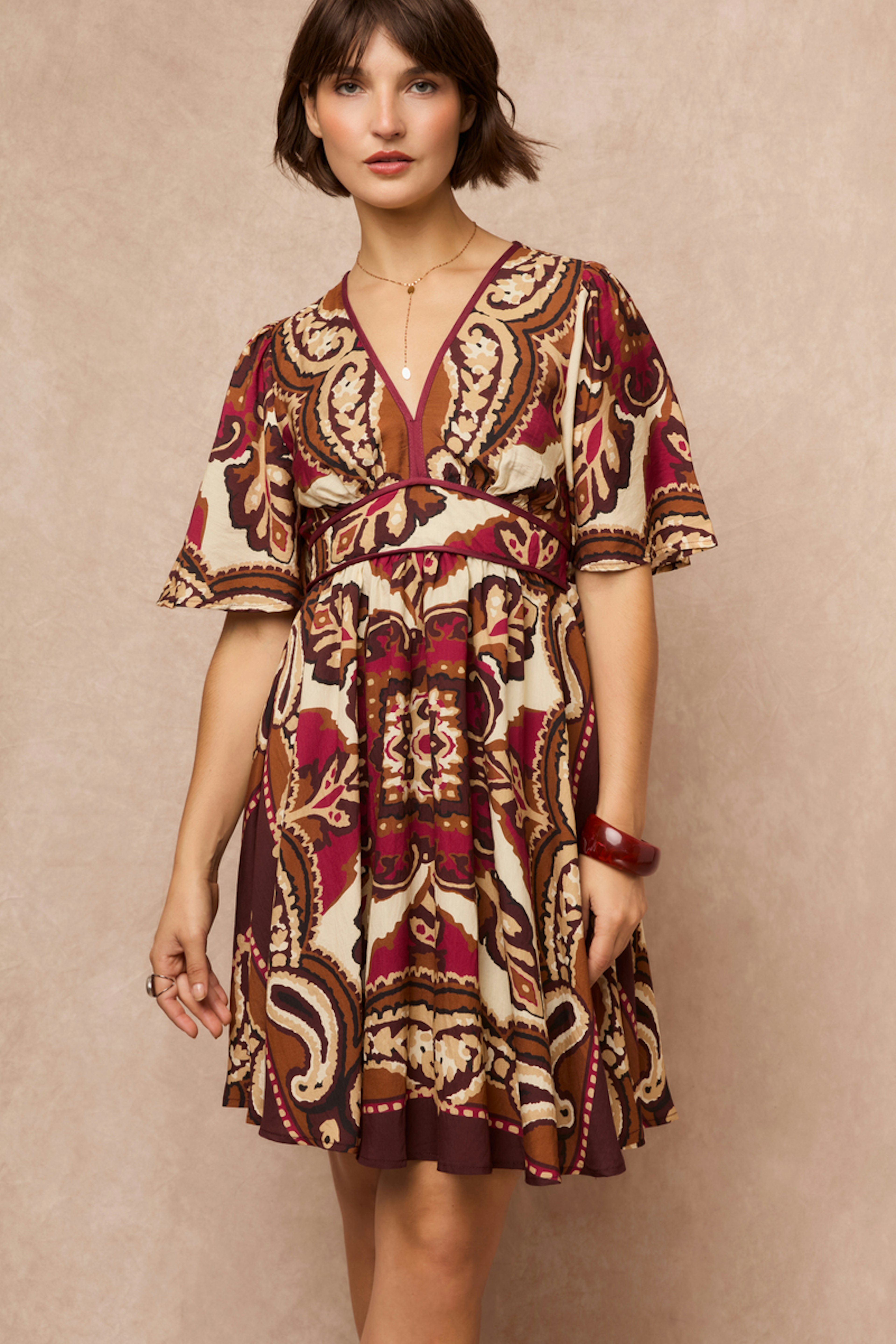 Deze geprinte jurk past perfect bij gouden sandalen en een rieten tas voor een chique en casual look. • Korte jurk • V-hals • Korte uitlopende mouwen • Taillering • Geprint motief