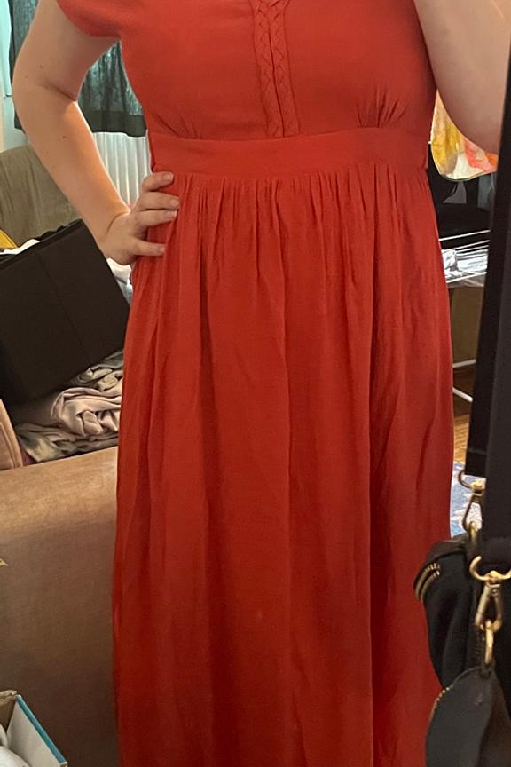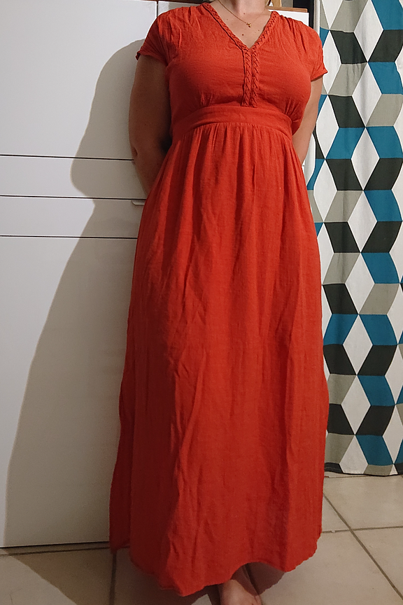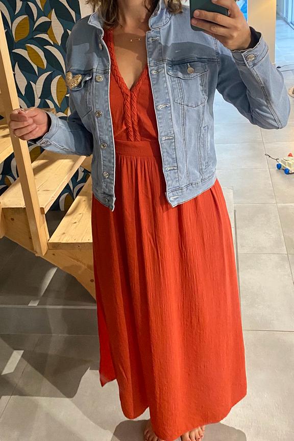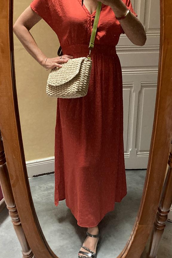 Combineer deze jurk met leren sandalen en een hoed met brede rand voor een relaxte zomerlook. - Lange jurk - V-halslijn op de rug - Geknoopte taille met riem - Korte mouwen - Split opzij