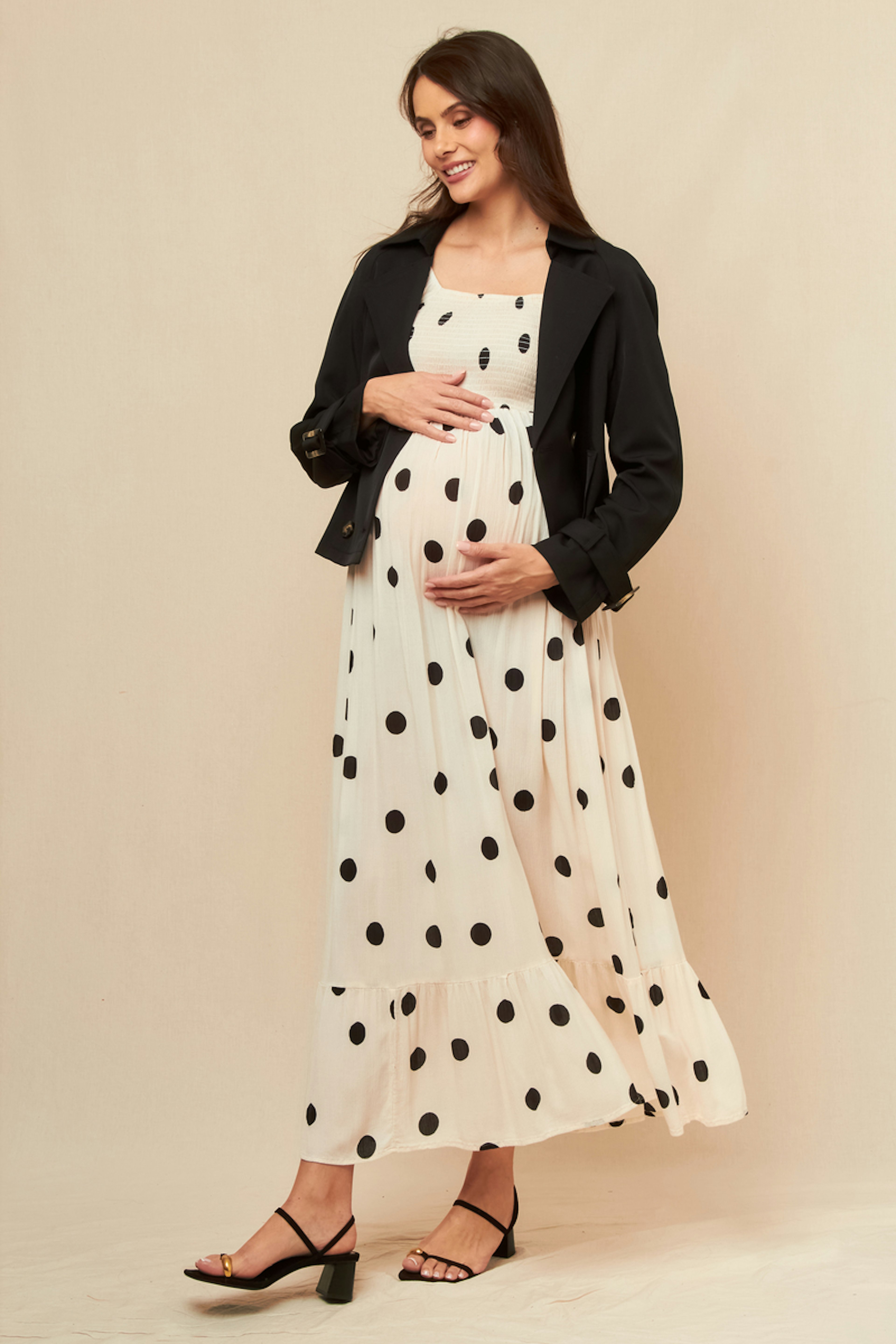 Kies voor zomerse elegantie met camelkleurige leren sandalen en een strooien hoed. Perfect voor een zonnige dag! - Lange vloeiende jurk - Recht model - Driekwart pofmouwen - Vierkante kraag - Stippenpatroon