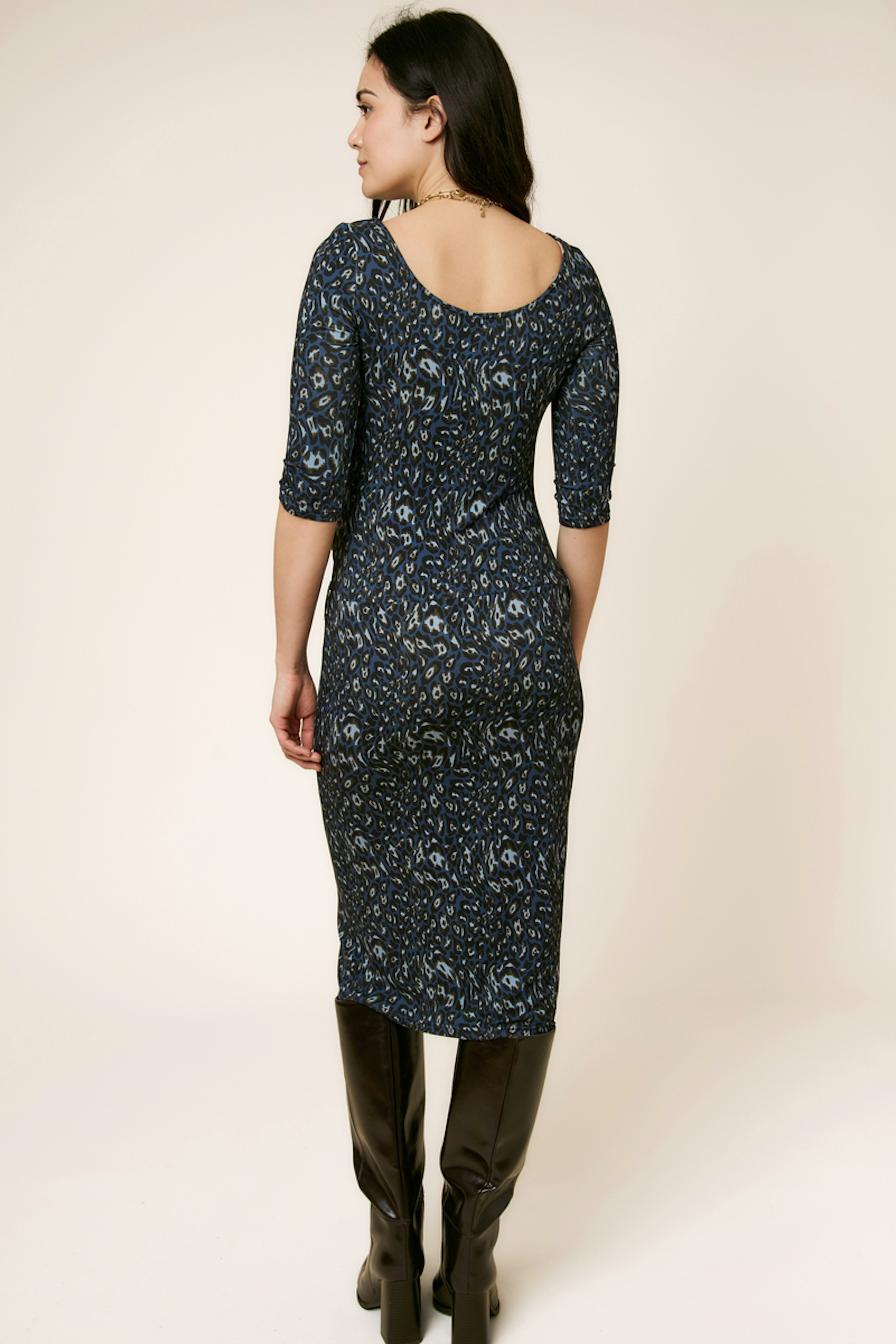 Draag het met een camel jas en hoge laarzen voor een chique winterlook. • Rechte jurk • Ronde hals • 3/4 mouwen • Middenkuitlengte • Blauw patroon