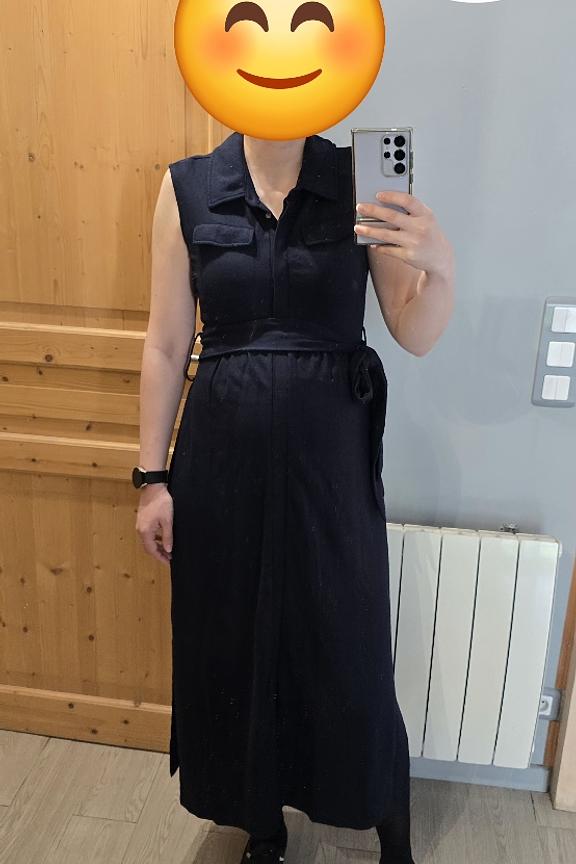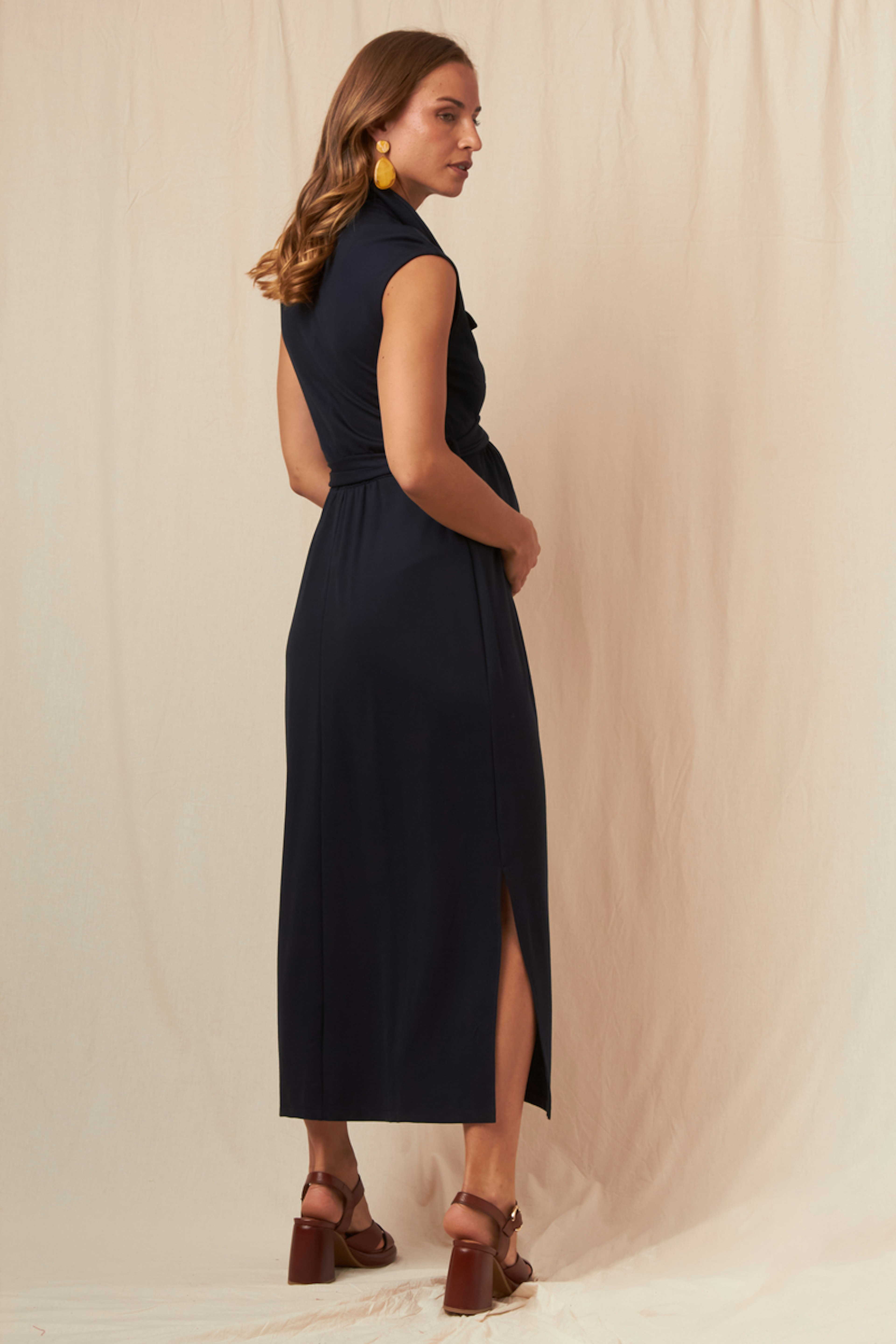 Combineer deze jurk met gouden sandalen en minimalistische accessoires voor een verfijnde zomerlook. - Lange jurk - Overhemdkraag - Mouwloos - Ceintuur - Elegante zijsplit