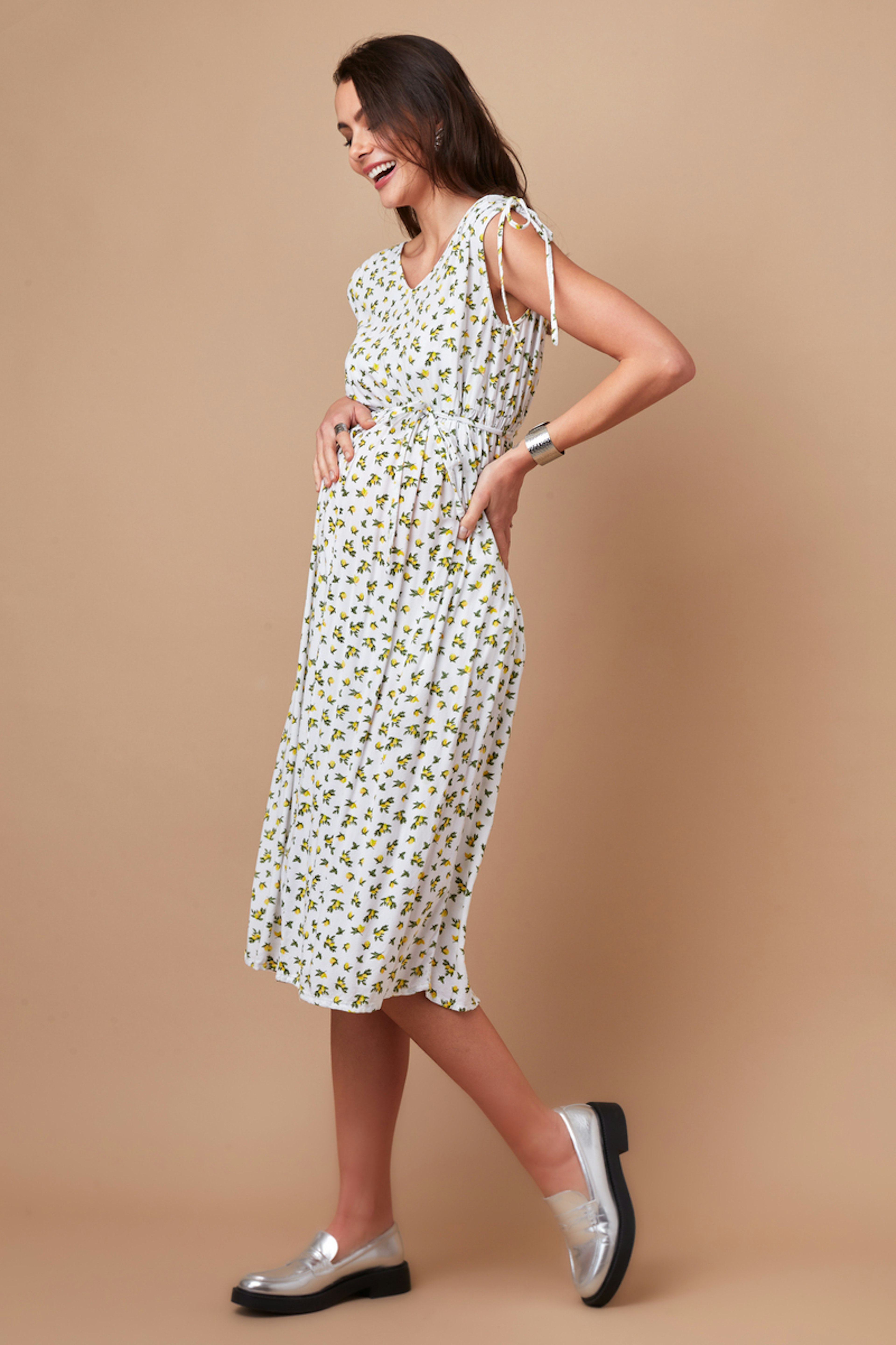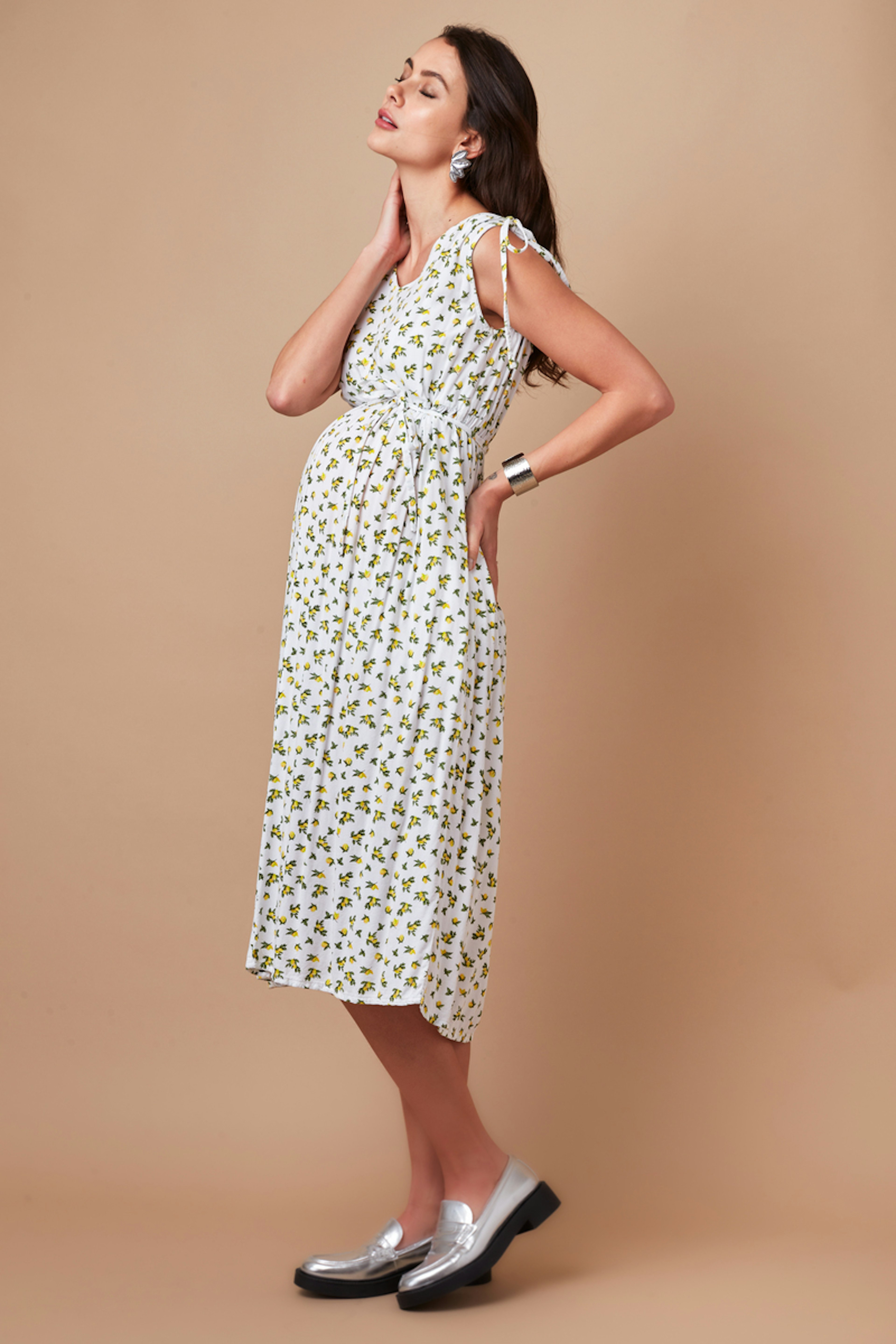 - Positie maxi jurk Limone - Mouwloos - Schouderbandjes - Aangesnoerd in de taille - V-hals - All-over bloemmotief