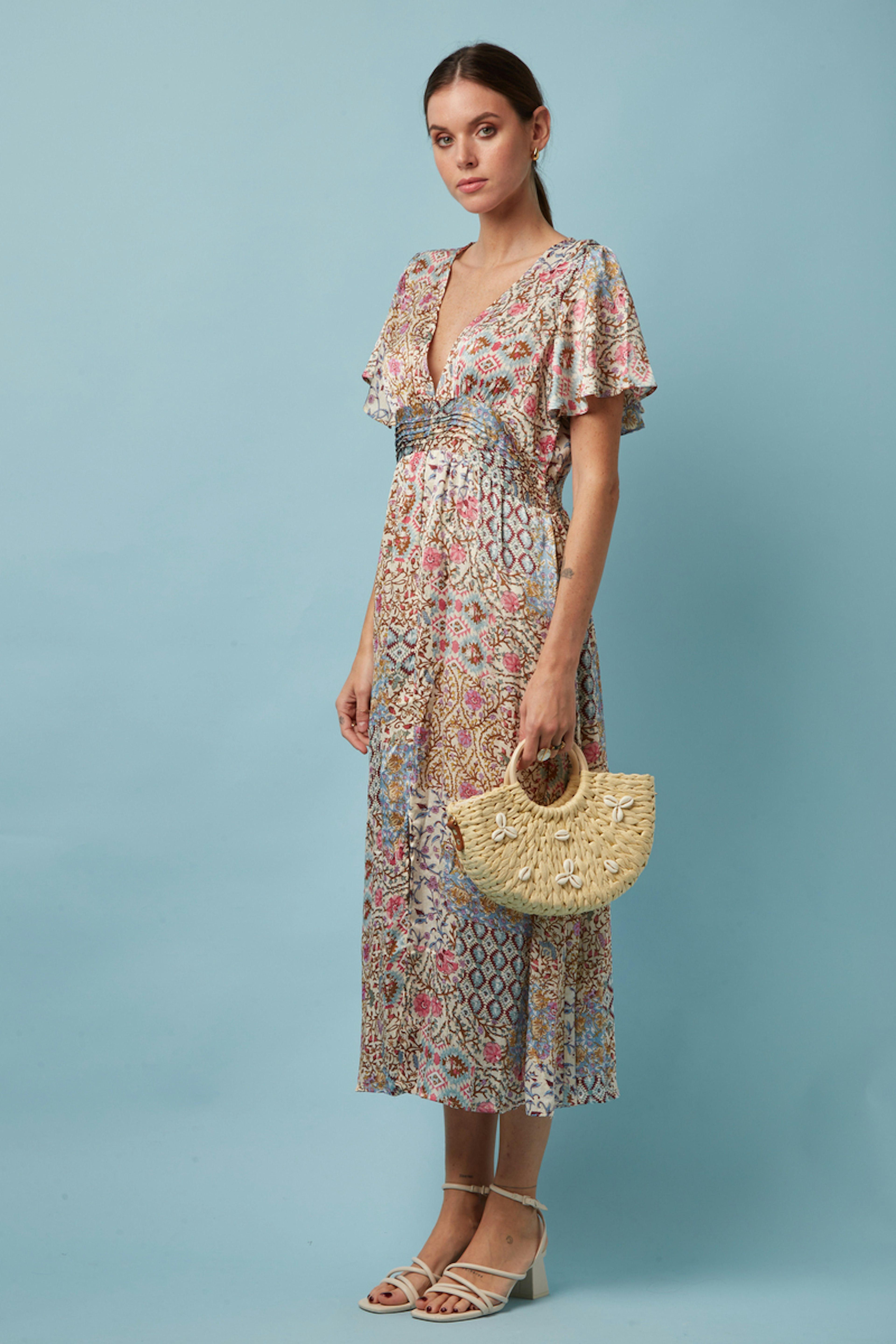 Ontsnap naar een zomerse tuin in deze Atelier Evene jurk, ideaal om in stijl te flaneren op zonnige dagen. - Polyester empire jurk - V-hals - Vloeiende korte mouwen - Verstelbare taille - Paisley motief