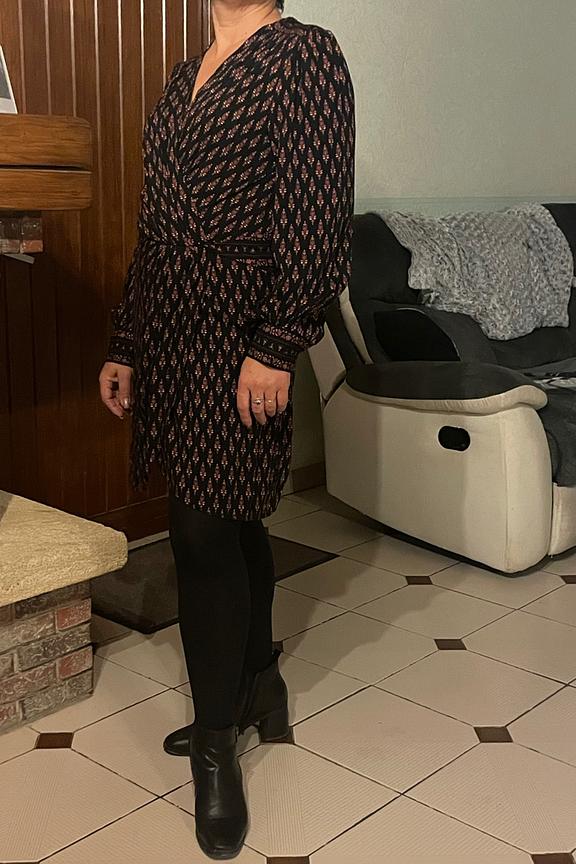 Kies voor leren enkellaarsjes en een lichte sjaal voor een chique look in koud weer. Deze jurk past perfect in al je winterse gelegenheden. • Portefeuille jurk • Flatterende V-hals • Elegante lange mouwen • Gekruiste zoom • Elegante print